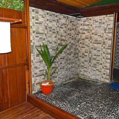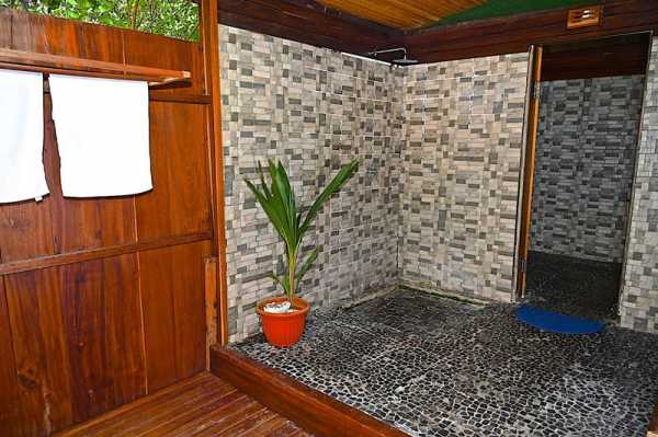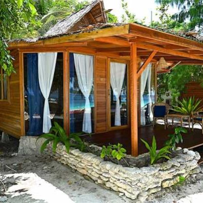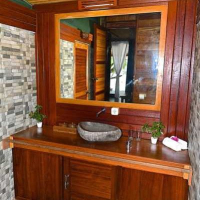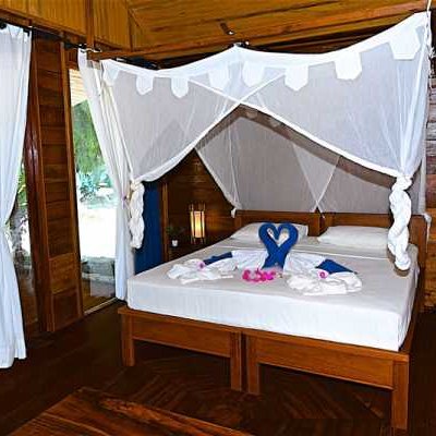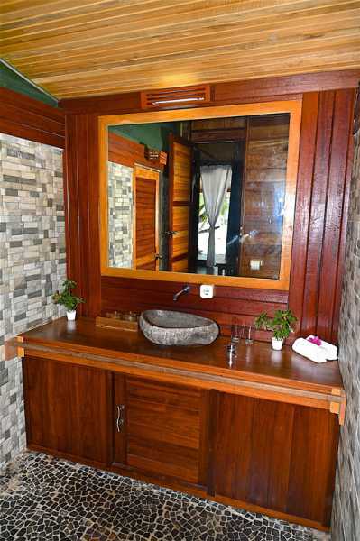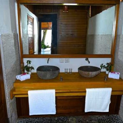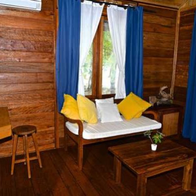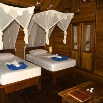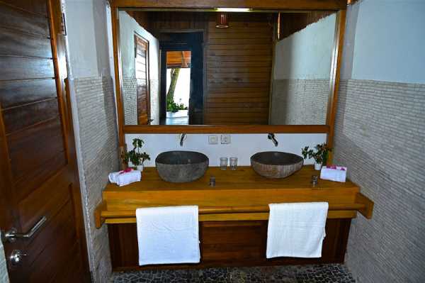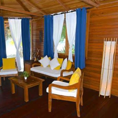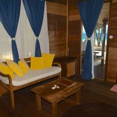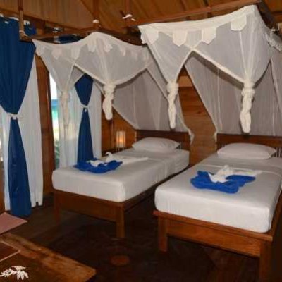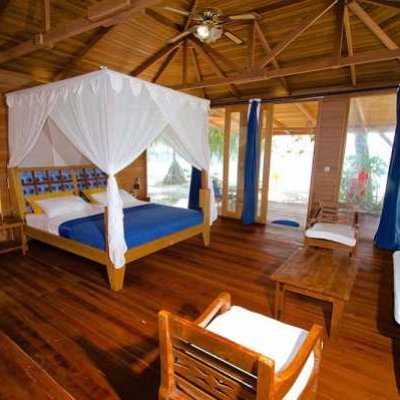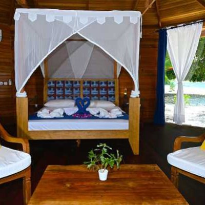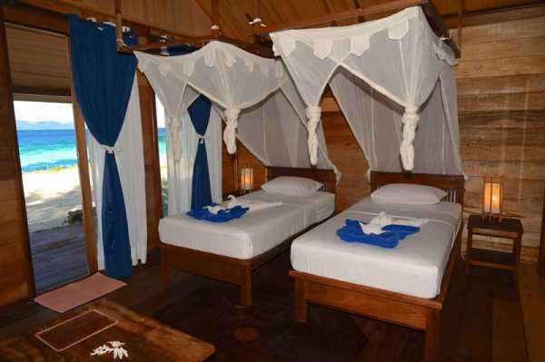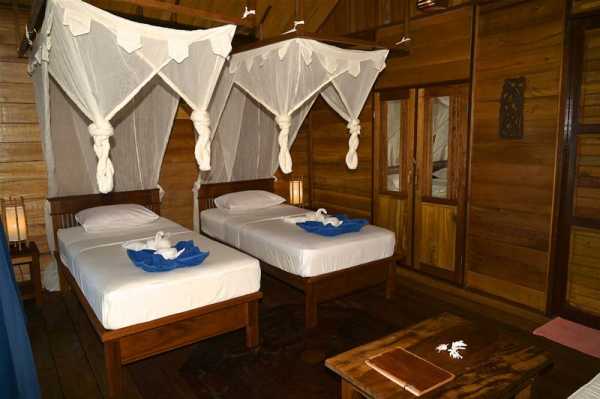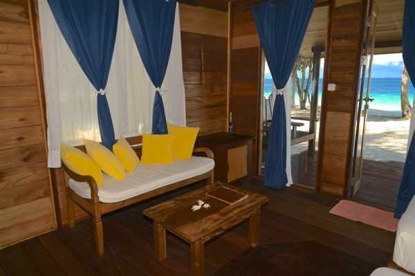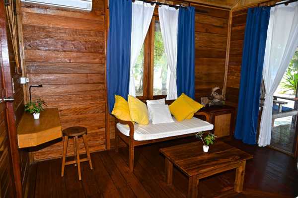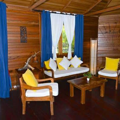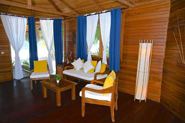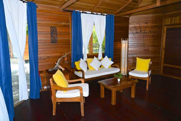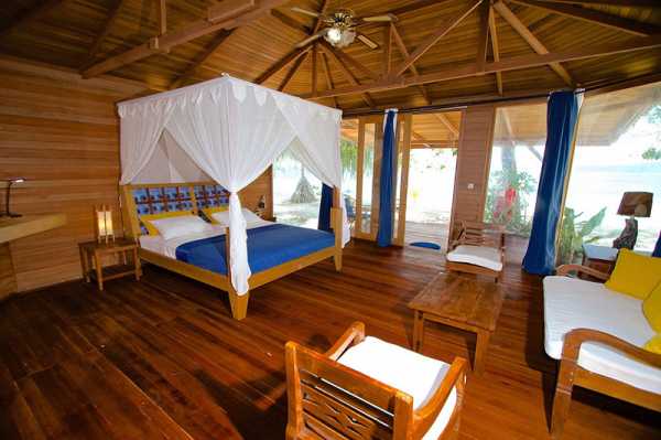 Роскошные коттеджи площадью 66 квадратных метров имеют восьмиугольную форму и построены из ценных пород дерева с большими окнами. Мебель очень аккуратная и качественная: кресла, столы и диваны ручной работы на Бали, изделия ручной работы - папуасские.