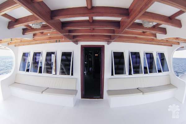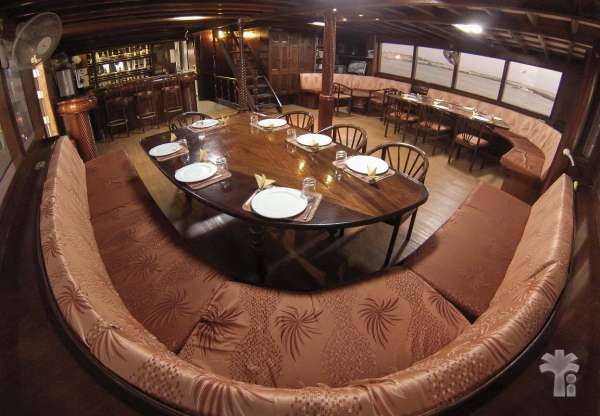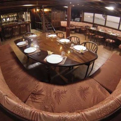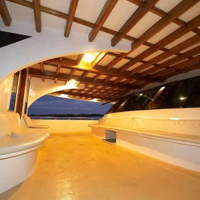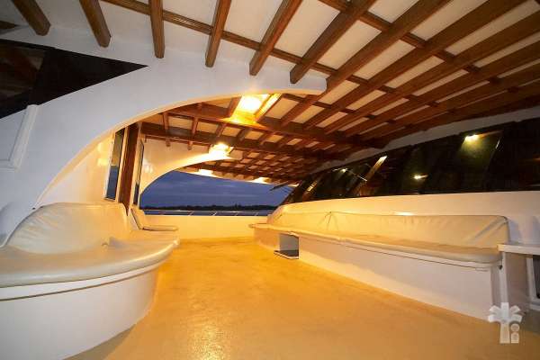 Основной салон с телевизором, стерео, DVD, телефон, настольные игры, библиотека, батареи зарядной станции (24 ч. 220 В переменного тока), бар, крытая палуба, кафе, современная кухня.