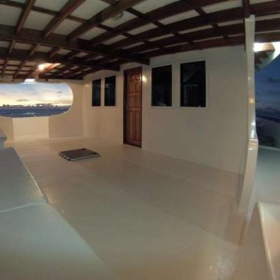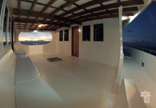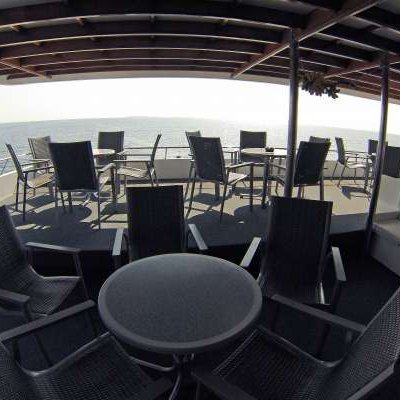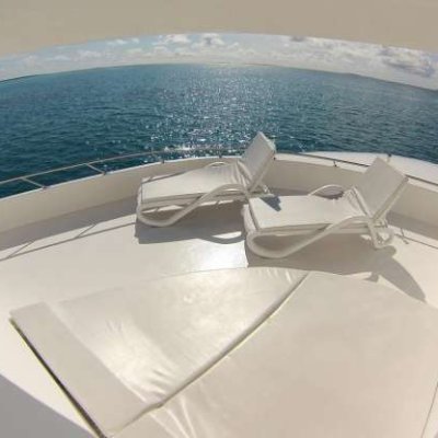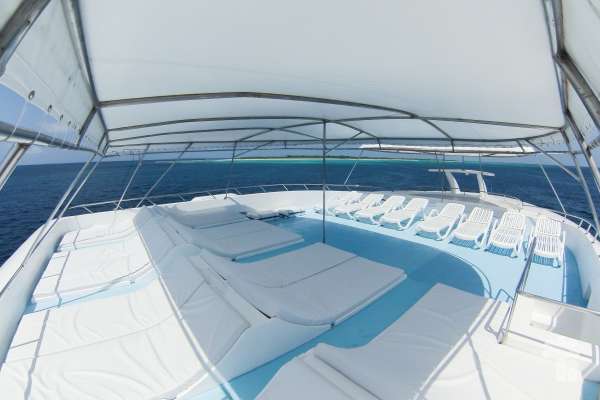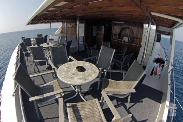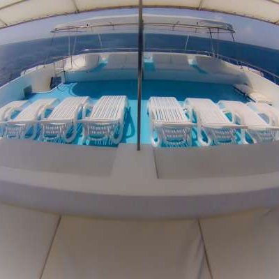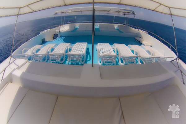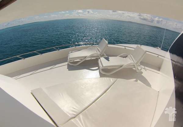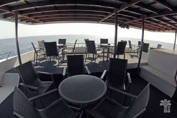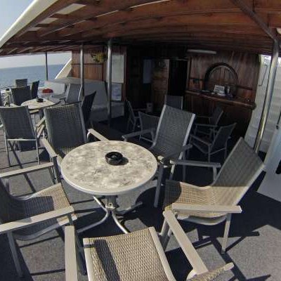 Верхняя палуба оснащена шезлонгами, столом и стульями, чтобы насладиться солнцем и тенью!