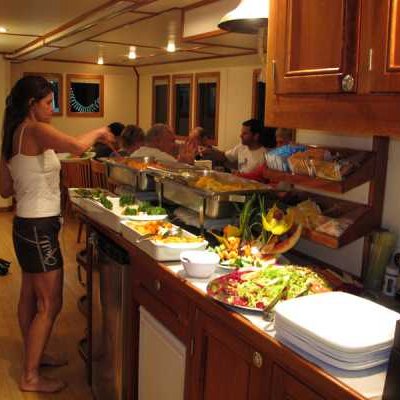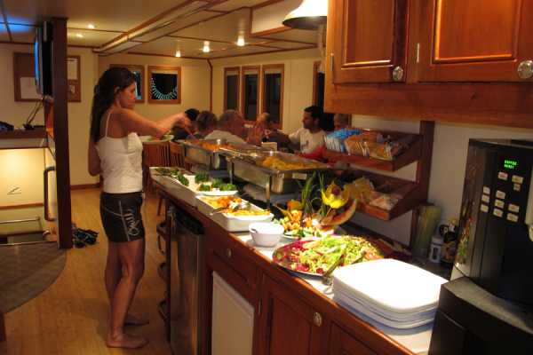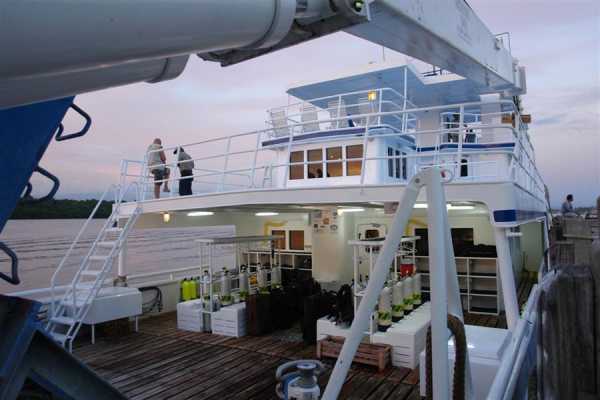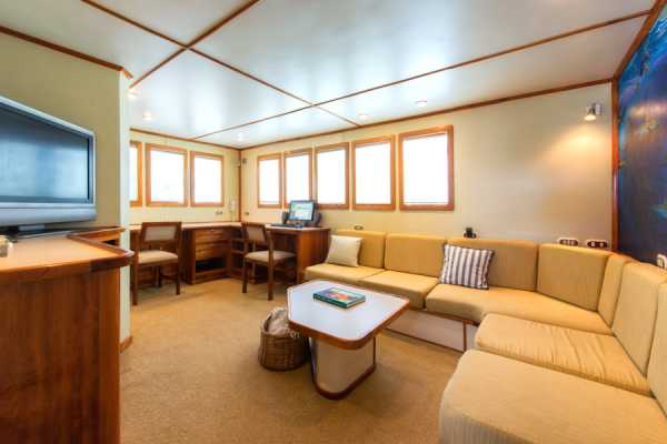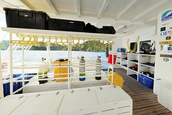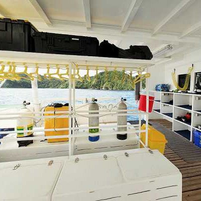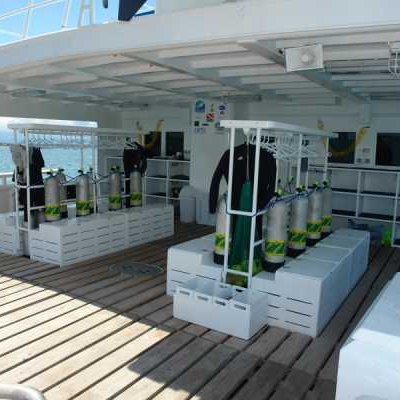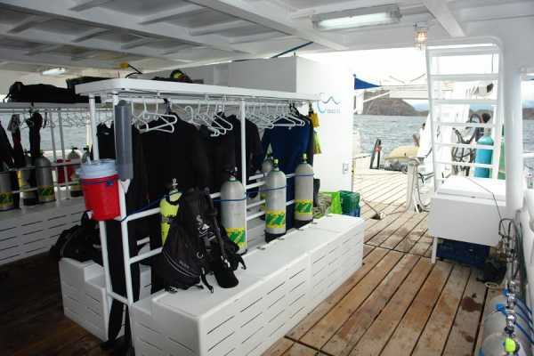 Очень комфортабельная, тщательно продуманная и разработанная для максимального удобства дайв-палуба: для каждого дайвера вы найдете здесь индивидуальные ячейки для фото/видеоаппаратуры со станцией подзарядки, ящики для хранения снаряжения, сушилки для полотенец и костюмов..