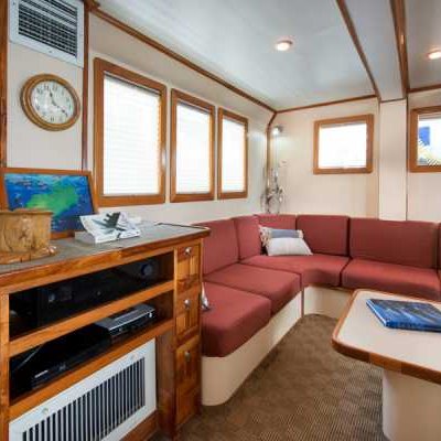 На главной палубе яхты размещается просторный, уютный салон кают-компании с теле/видео/аудиоаппаратурой и отдельный обеденный зал.