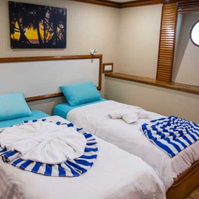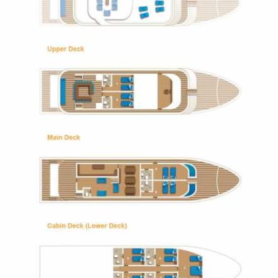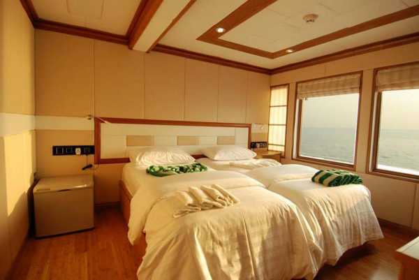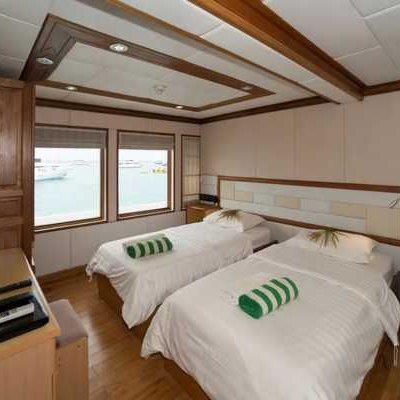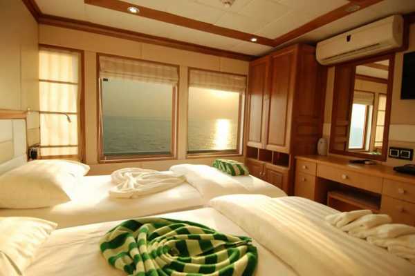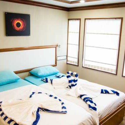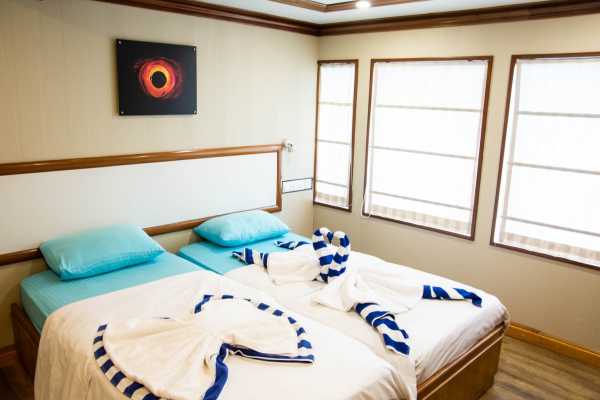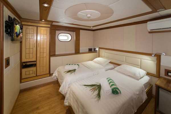 9 кают расположены на 3 палубах, каждая с двуспальной или двумя односпальными кроватями с удобными матрасами и постельным бельем, собственной ванной комнатой и индивидуальной системой кондиционирования воздуха.