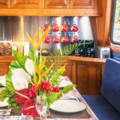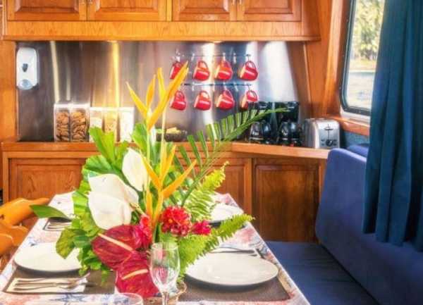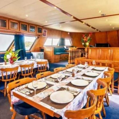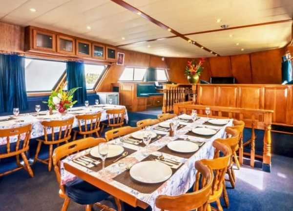 Кают-компания: салон для отдыха с CD/DVD-проигрывателем и телевизором, библиотекой и игротекой, обеденный зал, барная стойка, холодильник с напитками