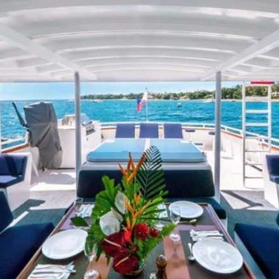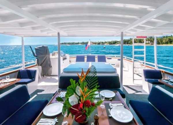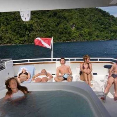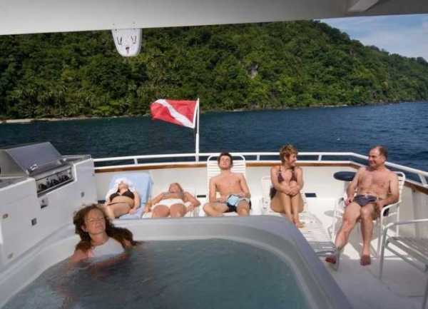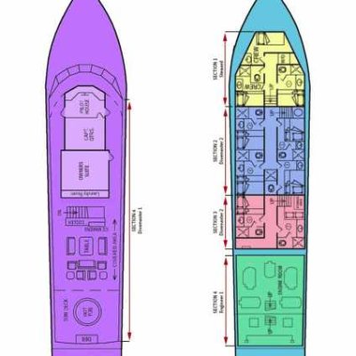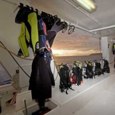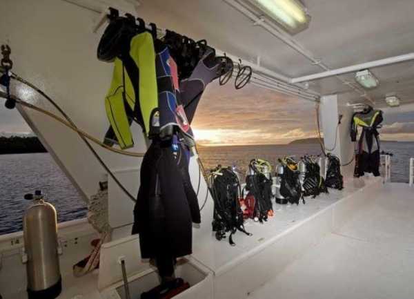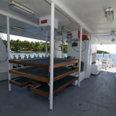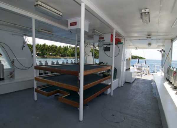 Дайв-дек: стойки с баллонами (11- и 15-литровые DIN/Yoke), стол для фото/видеокамер, зарядные станции, емкости для опреснения снаряжения, 2 душевых шланга, 2 дайв-трапа, санузел