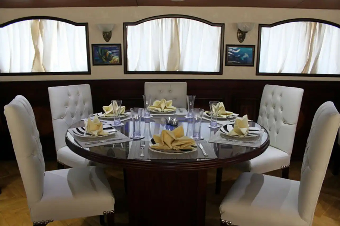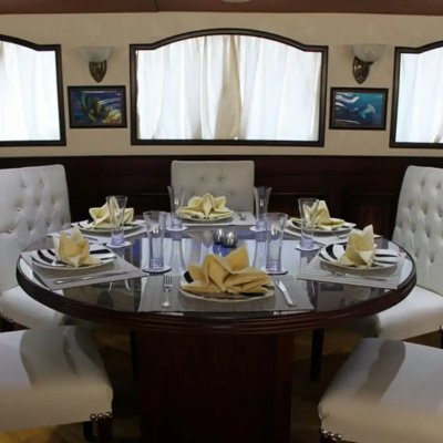 Просторная кондиционированная кают-компания c плазменной панелью, DVD и музыкой, отдельный салон для принятия пищи и 2 просторных сан-дека с оборудованными местами для отдыха обеспечивают максимальное удобство и создают неповторимую атмосферу отдыха для пассажиров. Просторный дайв-дек и платформа покрыты тиком.