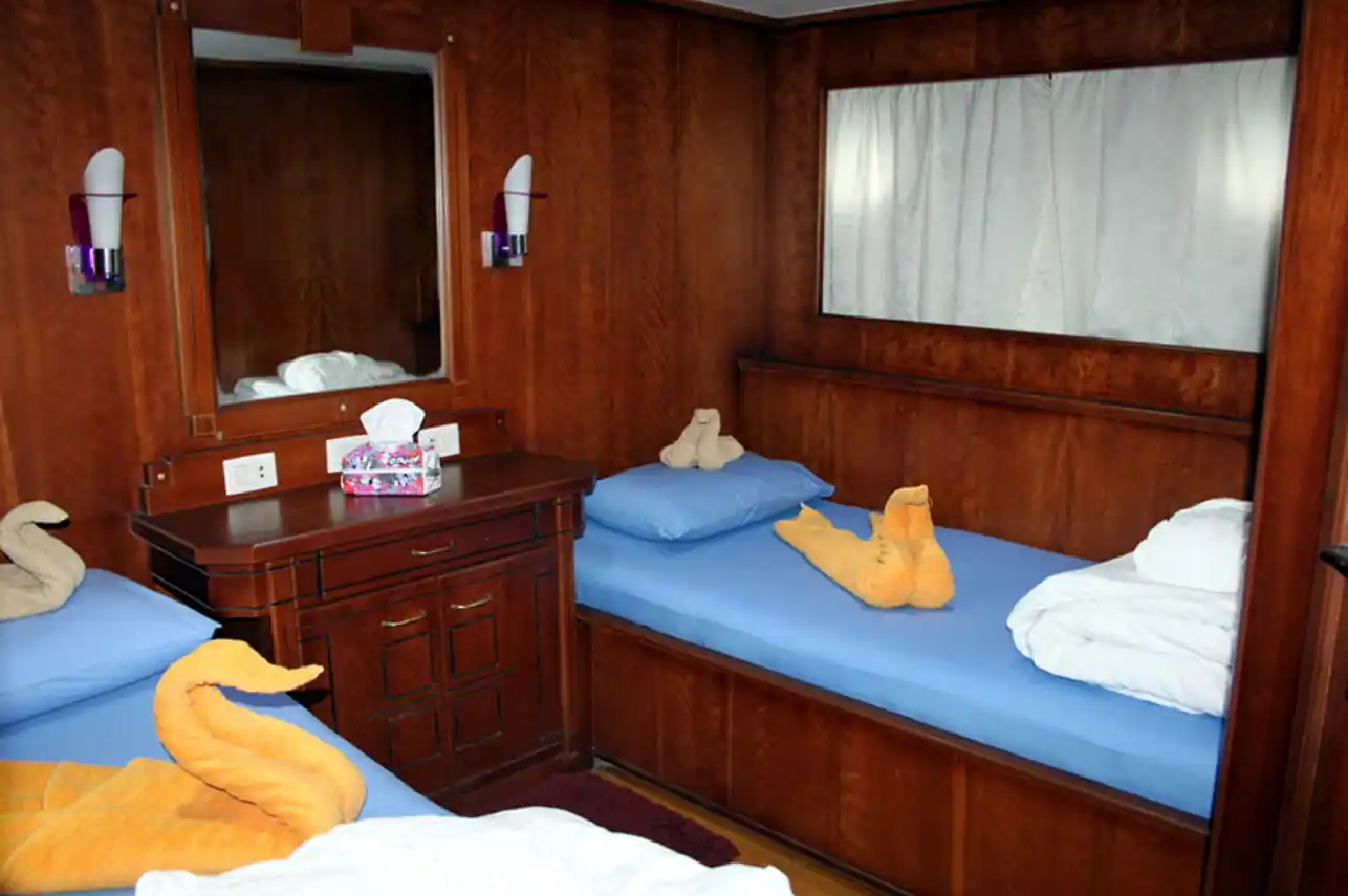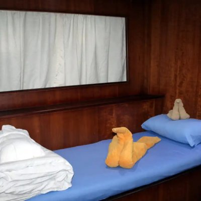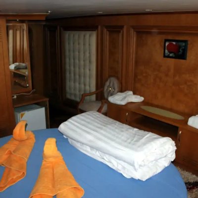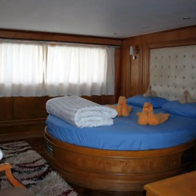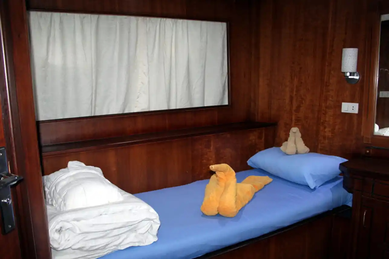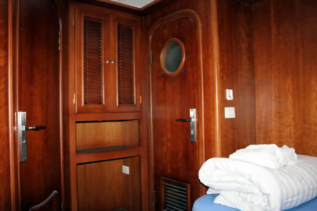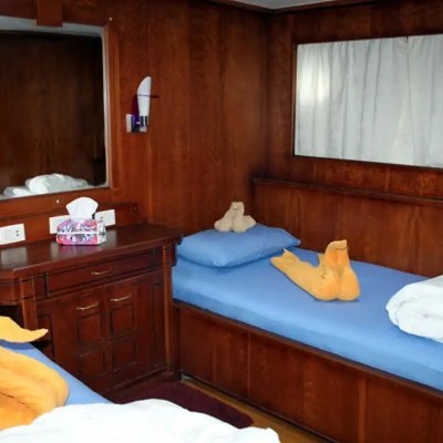 Эта деревянная яхта длинной 36 метров и шириной 8 метров расчитана на размещение 20 пассажиров в 8-ми двухместных каютах с односпальными кроватями и двух сьютах с двухместными кроватями.