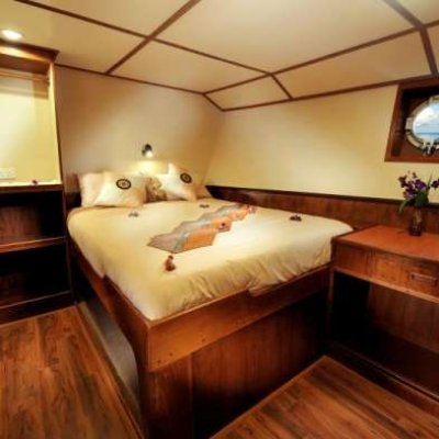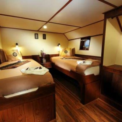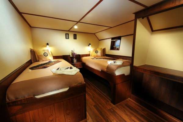 4 двухместные каюты Deluxe: 2 каюты с двуспальной кроватью и 2 каюты с двуспальной и дополнительной кроватью-полкой, санузел с душем, кондиционер