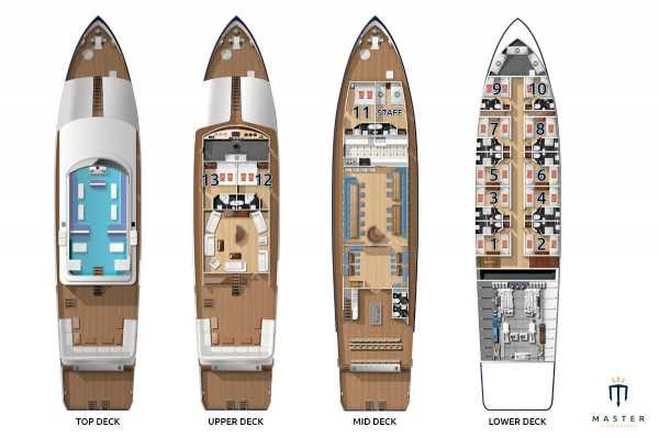 Гости размещаются в 13 каютах следующих категорий: