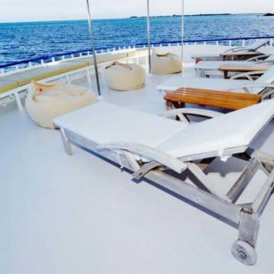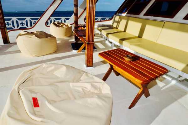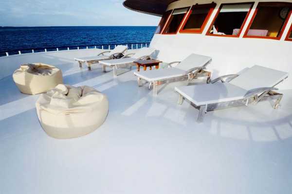 Большая солнечная палуба оснащена мягкими шезлонгами на корме лодки для отдыха между погружениями.