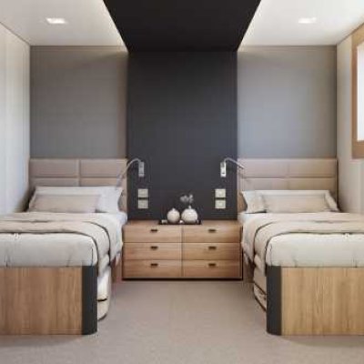 Во всех каютах Deluxe по две односпальные кровати, 2 иллюминатора, отдельные ванные комнаты и душевые, индивидуальный климат-контроль, монитор с медиаплеером и фен, банные халаты, смена полотенец — каждый день.