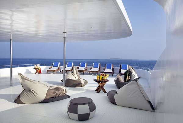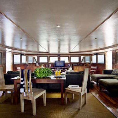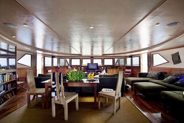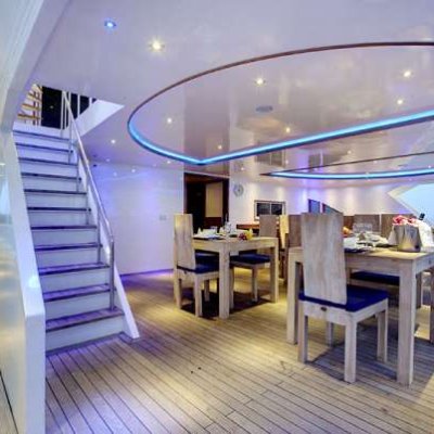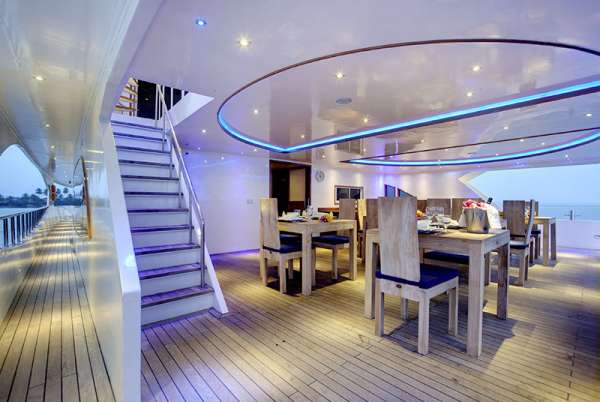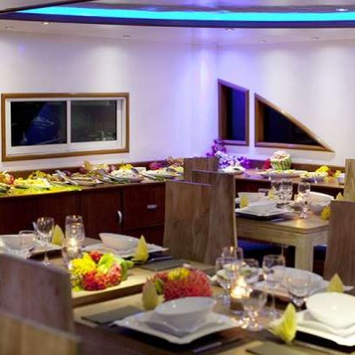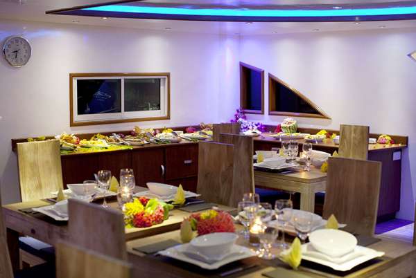 В кормовой части первой палубы находится просторный ресторан, в котором подают блюда международной, итальянской и мальдивской кухни, в основном приготовленные из свежей рыбы, хотя повара всегда готовы удовлетворить любые потребности гостей.