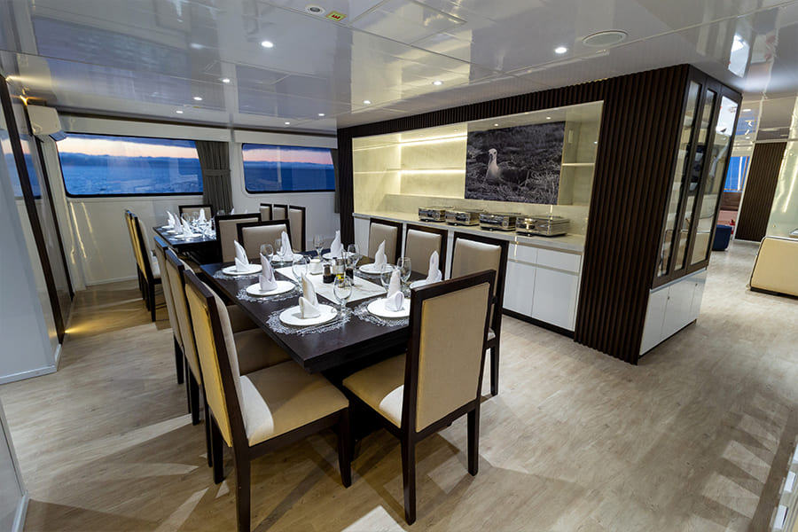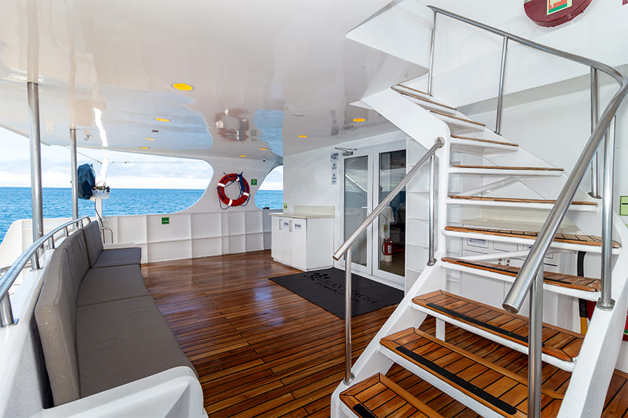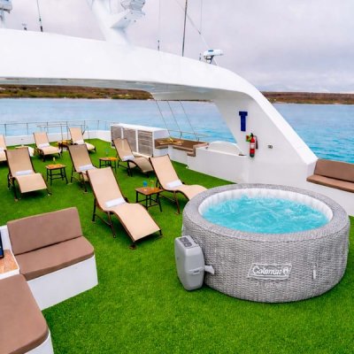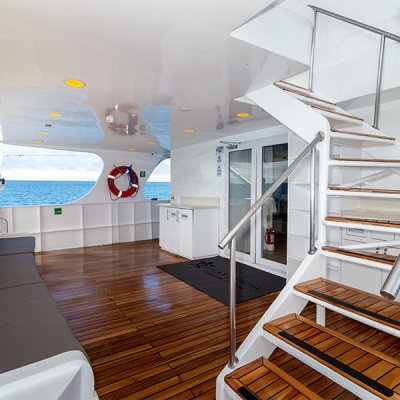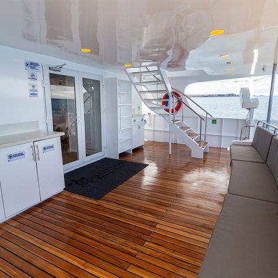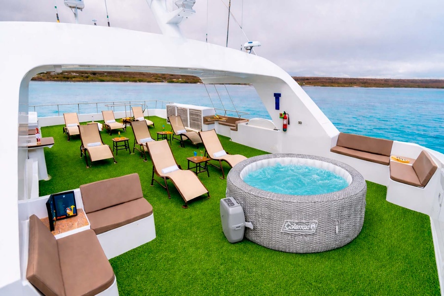 Пространство, созданное для полного расслабления между погружениями. Солярий оборудован просторными зонами с удобными шезлонгами, открывает 360-градусный панорамный вид и оснащен портативным джакузи, продуманно интегрированным, чтобы дарить моменты чистого релакса в море. Наслаждайтесь успокаивающим теплом воды, любуясь бескрайним горизонтом Галапагосов, и достигайте идеального баланса между приключением, комфортом и исключительностью.