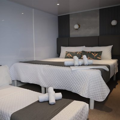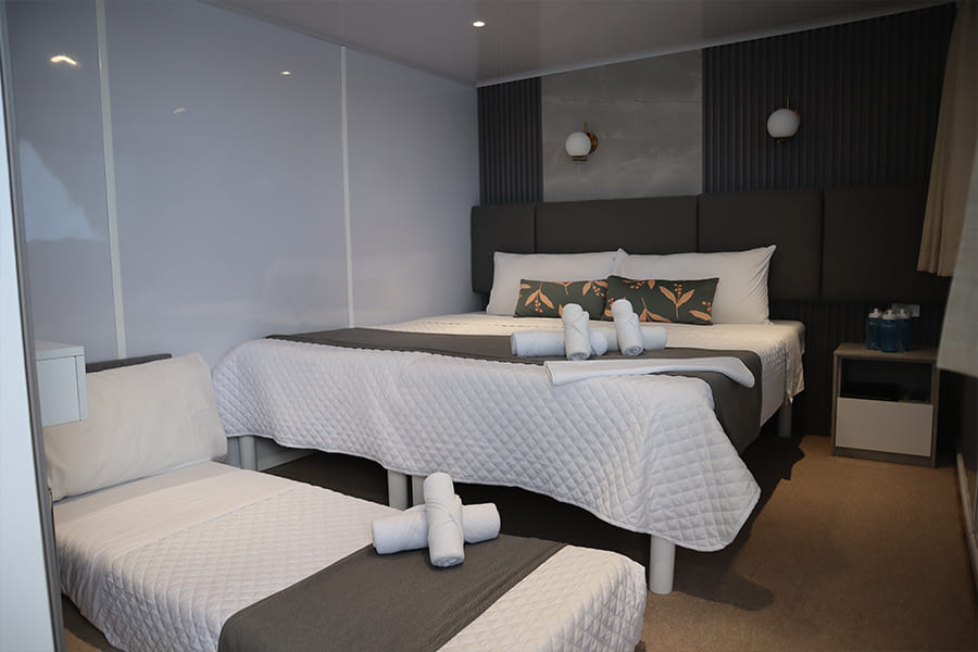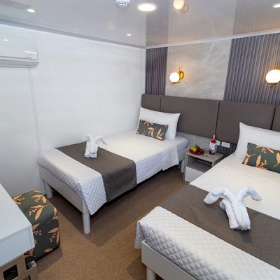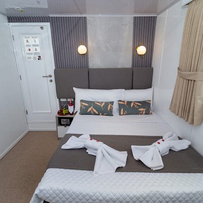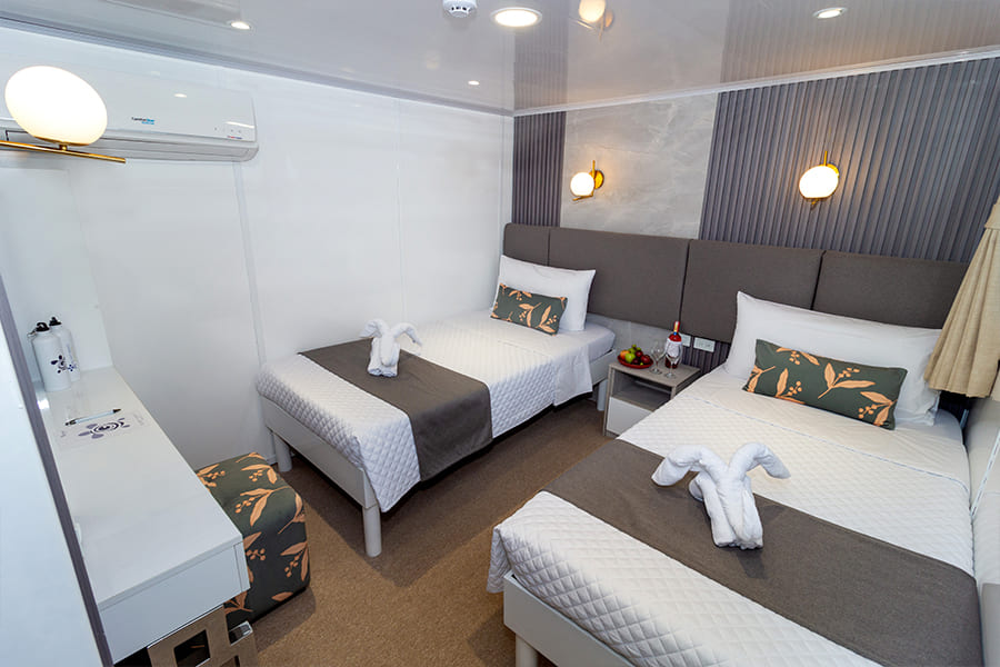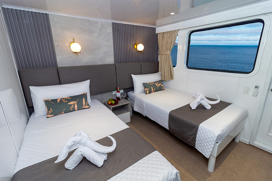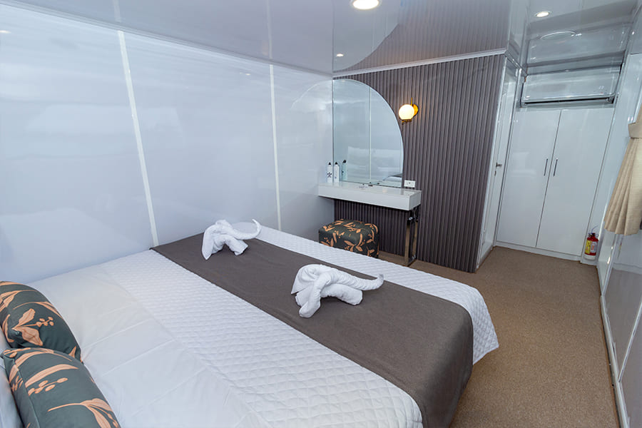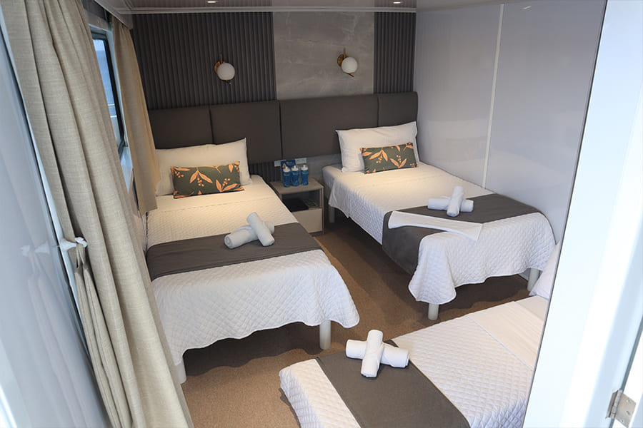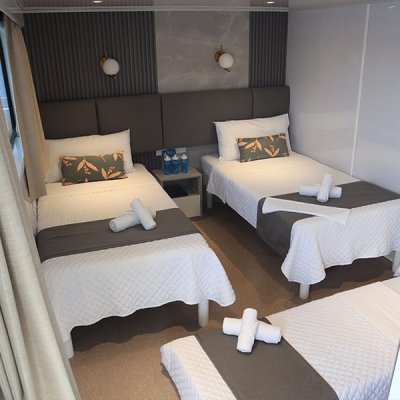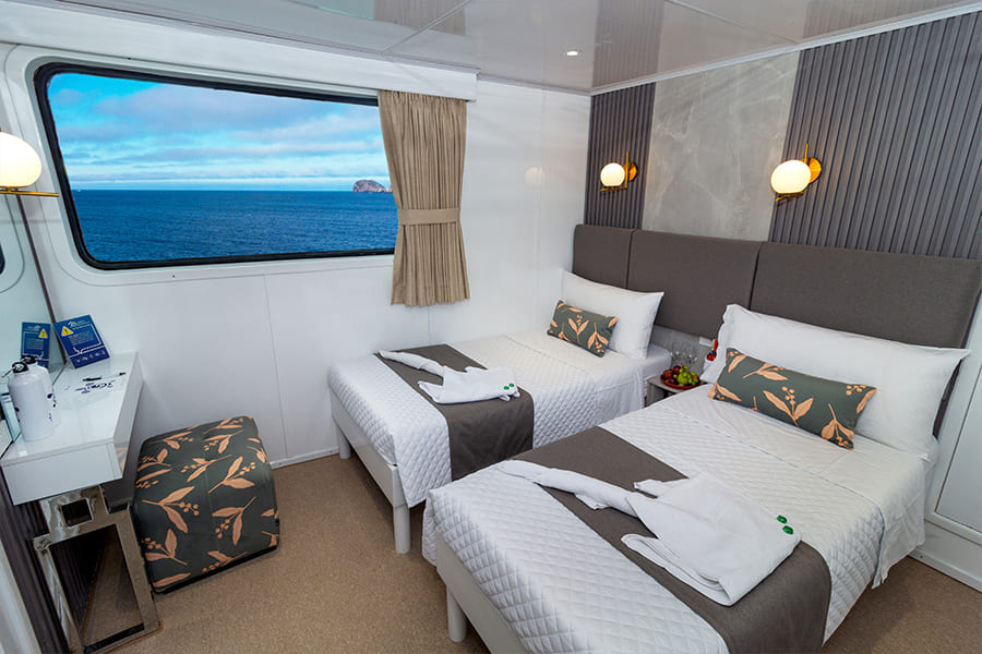 Расположены на верхней палубе, идеально подходят для пар или друзей. Имеются 4 двухместные каюты, которые можно трансформировать в каюту с двуспальной кроватью. Каюты оснащены большими окнами, которые наполняют помещение красивым светом и открывают захватывающий панорамный вид на океан.