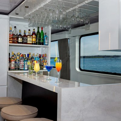 Расположенный на главной палубе, рядом с гостиной, бар предлагает широкий выбор коктейлей, национальных и импортных напитков, а также экзотические местные соки.