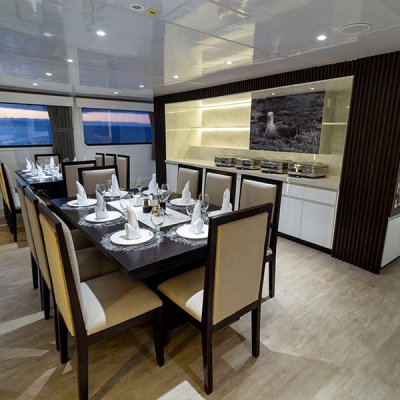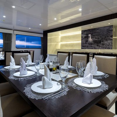 Расположен на главной палубе. Здесь вы можете насладиться разнообразной вкусной кухней, включающей национальные и интернациональные блюда, которые подаются по меню и в формате шведского стола. Пожалуйста, сообщите о любых диетических предпочтениях (для вегетарианцев, веганов, непереносимость глютена и т.д.) до бронирования. Зал рассчитан на 16 человек. Также здесь круглосуточно доступны станция с питьевой водой и горячие напитки.