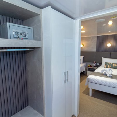 Каждая каюта оборудована сейфом, гардеробом, индивидуальным кондиционером и электрическими розетками для зарядки устройств.