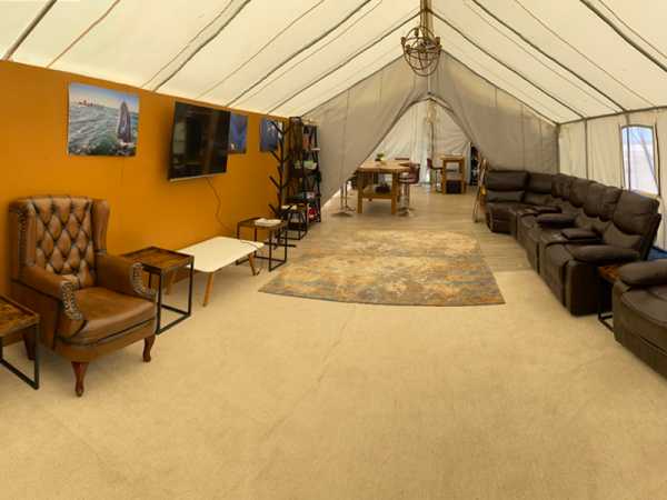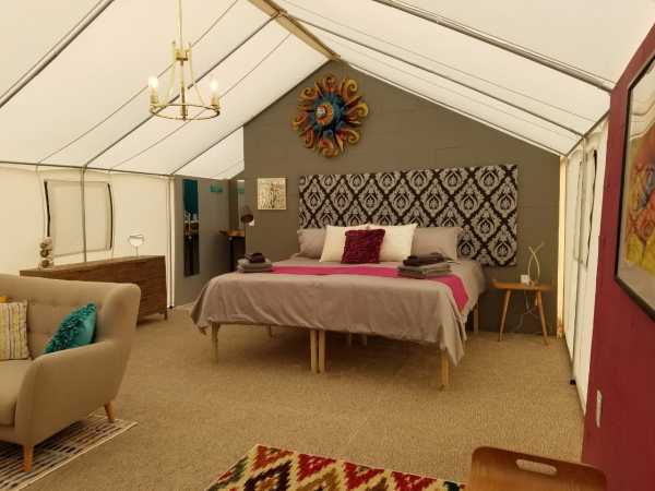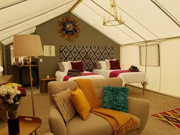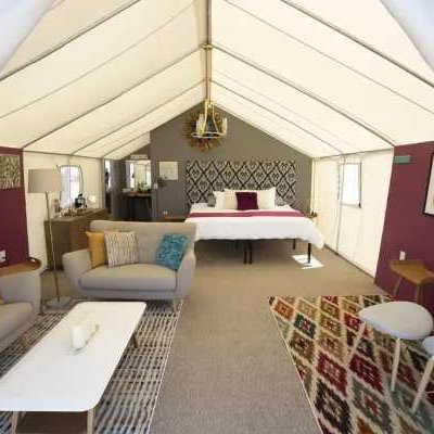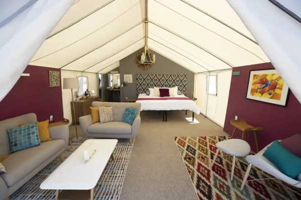 В роскошных палатках есть все удобства палаток для глэмпинга, но они также обеспечивают дополнительную приватность и более просторное жилое пространство. В 12 роскошных палатках также есть собственная ванная комната и комод в спальне, а также отдельная зона отдыха с диваном и мягкими креслами — идеальное место для отдыха после дня приключений!