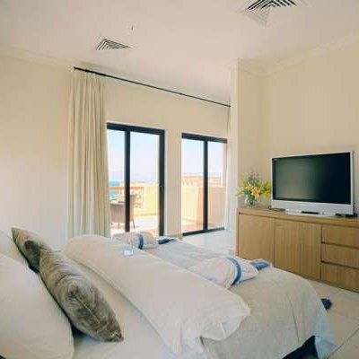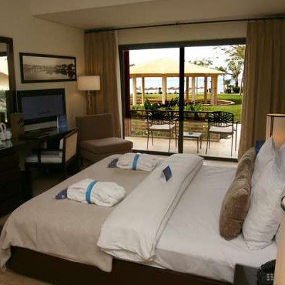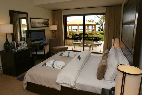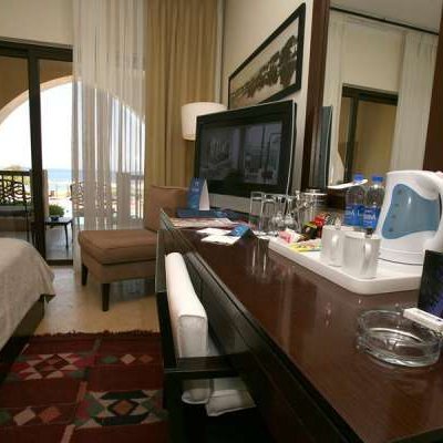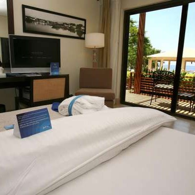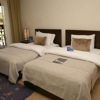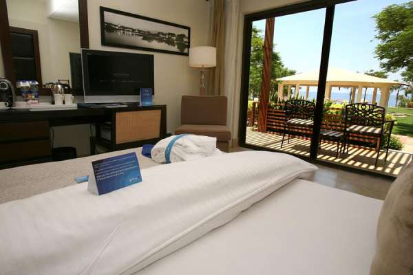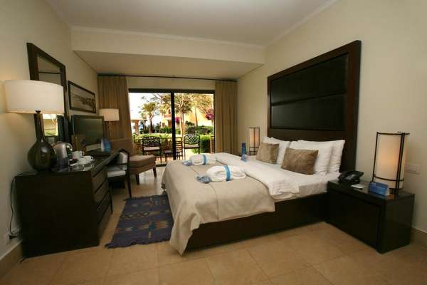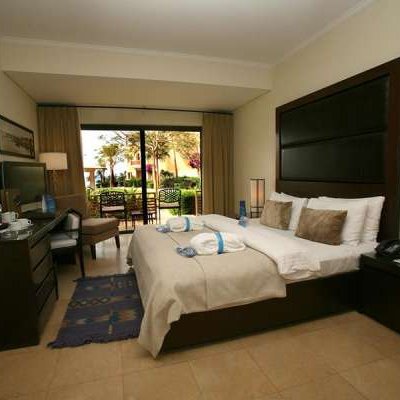 Гости курортного отеля Grand Tala Bay Resort могут остановиться в номерах с большими окнами и отдельным балконом, частично с видом на Красное море.
