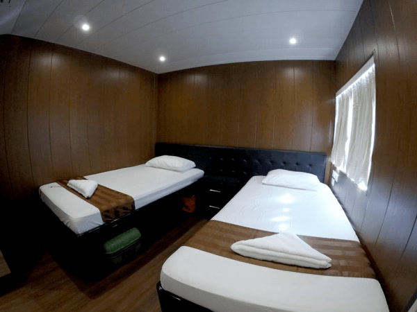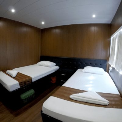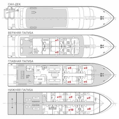 - 3 трехместные каюты Standard с двумя односпальными кроватями на одном уровне и одной односпальной кроватью на втором уровне.