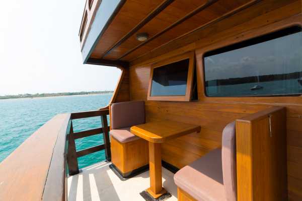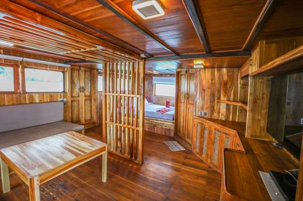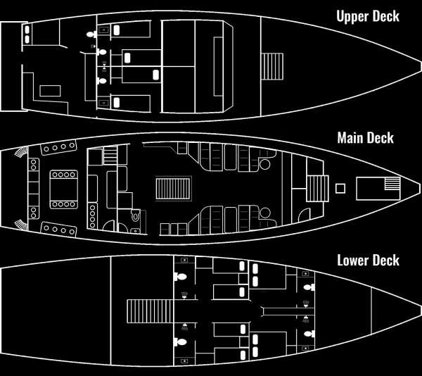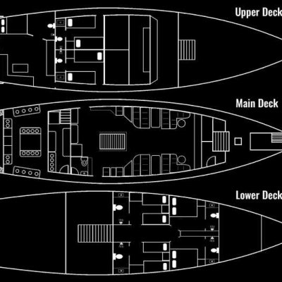 На трёх палубах, помимо кают, гости найдут комфортный салон и просторный дайвдек. Все каюты оборудованы просторными шкафами с множеством места для Вашего багажа, столиками, где Вы сможете заполнить свой логбук после насыщенного дня дайвинга.