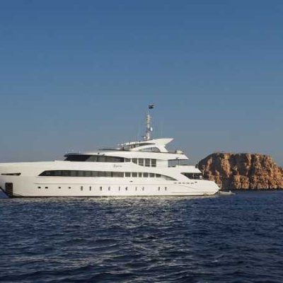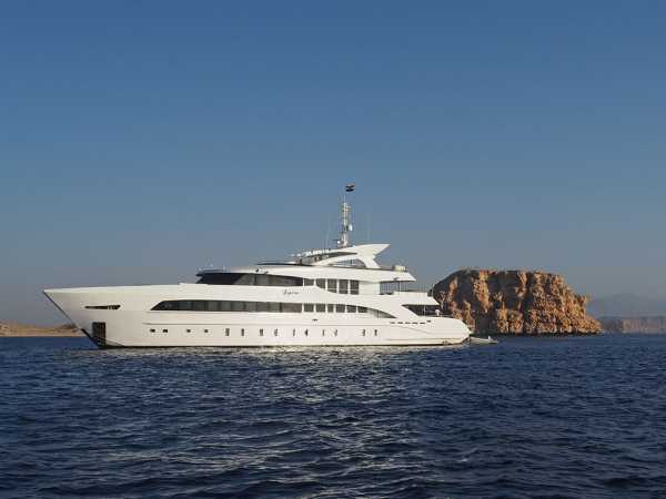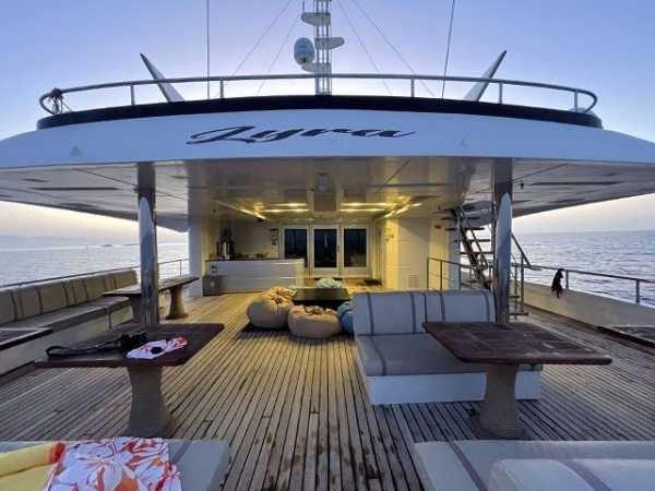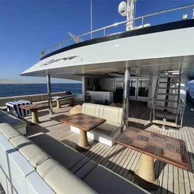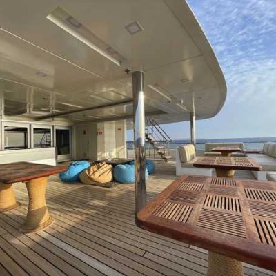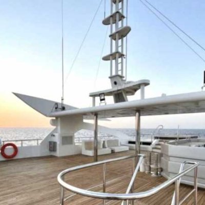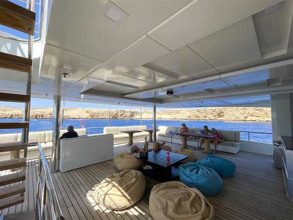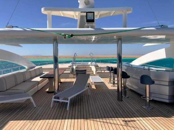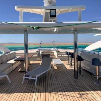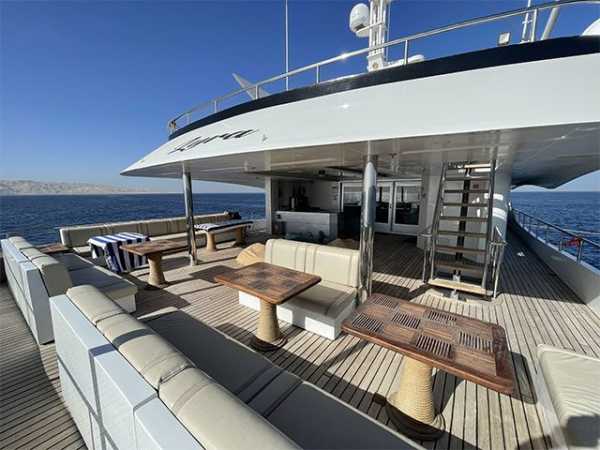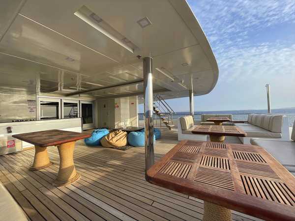 47 метров длиной, и почти десять в ширину, три палубы, солнечная терраса с джакузи и бары на каждой палубе - все это говорит о комфорте и широте зон приема гостей настолько, что каждый из 30 гостей может найти свое идеальное индивидуальное место для принятия солнечных ванн, общения, чтения, созерцания горизонта или наслаждения аперитивом.
