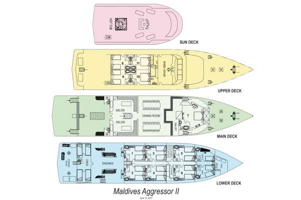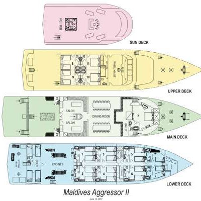 Maldives Aggressor II - современная, просторная и стильная яхта, которая соответствует всем требованиям комфорта и безопасности, как доказательство имеется сертификат СОЛАС. Моторы на судне дизельные, яхта развивает скорость до 12 узлов. Вы будете приятно удивлены красотой салона, уютом солнечной палубы с шезлонгами, ассортиментом бара и возможностями фото-центра.