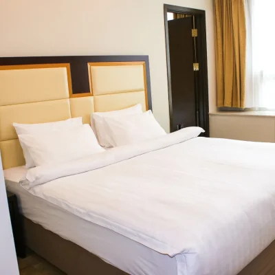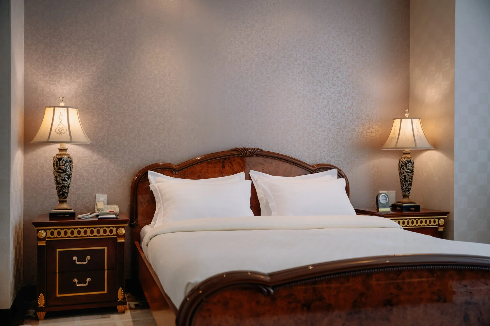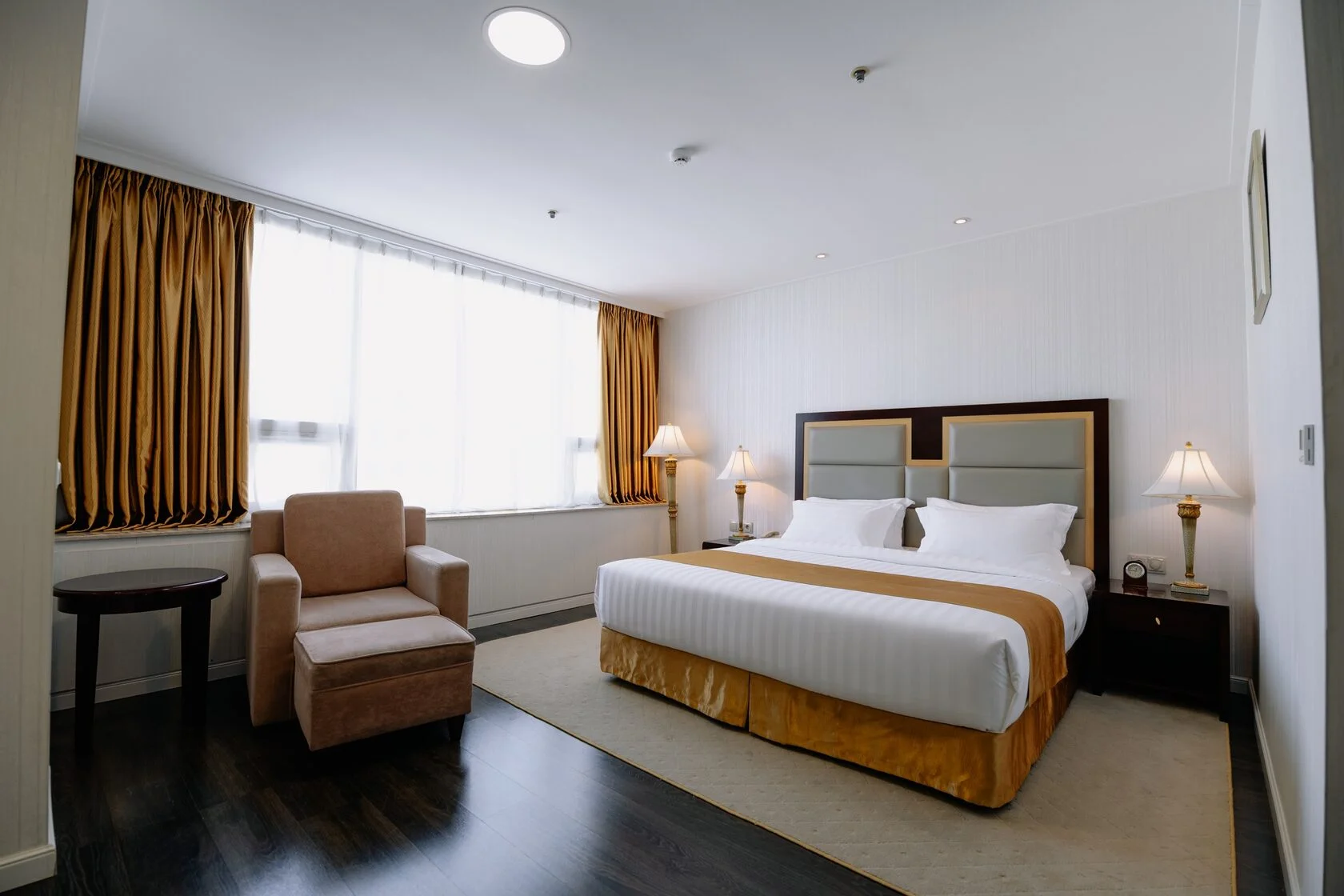 Однокомнатный номер с большой кроватью King Size, ванной комнатой с совмещенным санузлом, пл.: 26 кв.м; в номере: Телевизор, Холодильник, Мини-бар, Чайник, Рабочий стол, Телефон, Сейф, Комплект офисных принадлежностей.