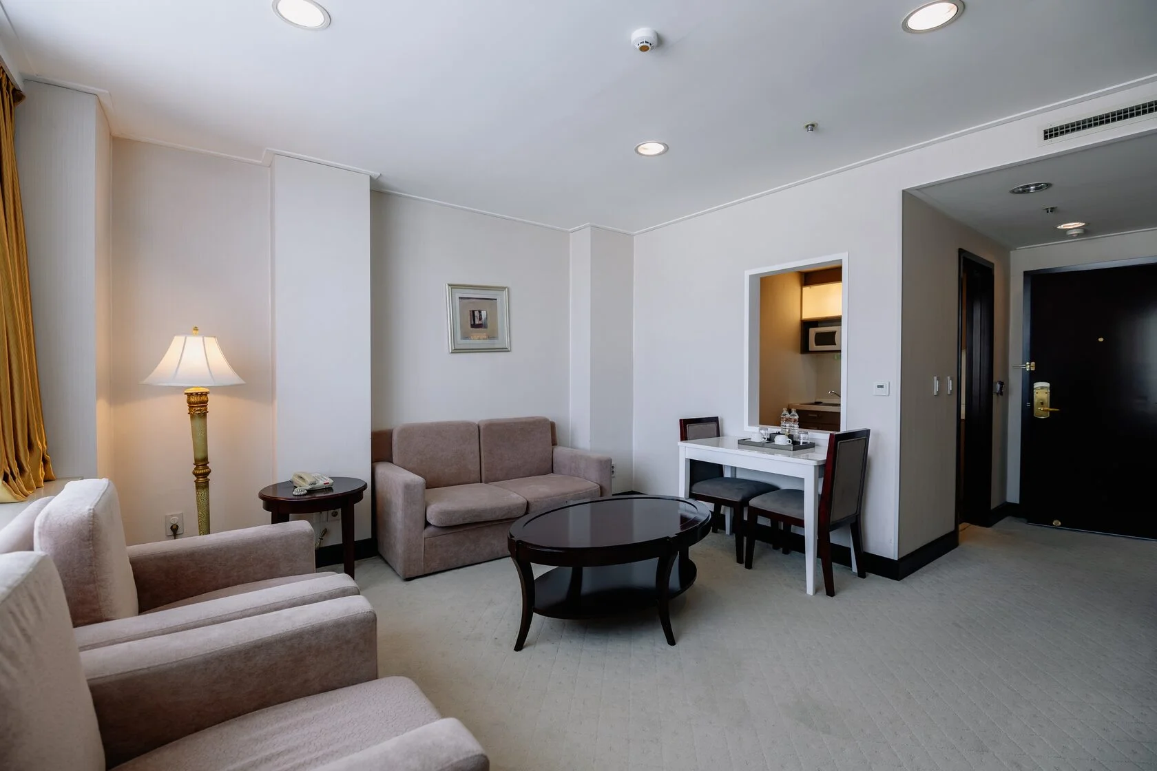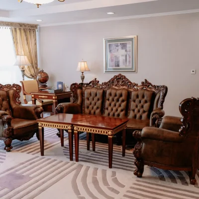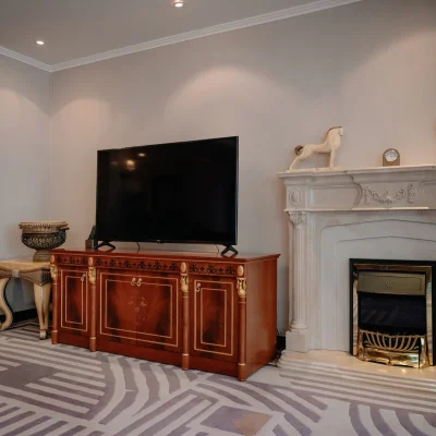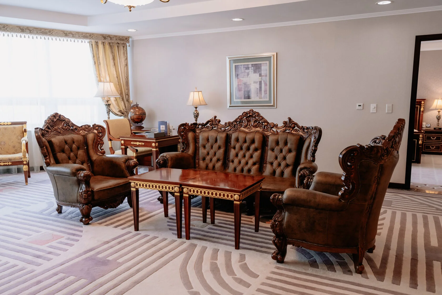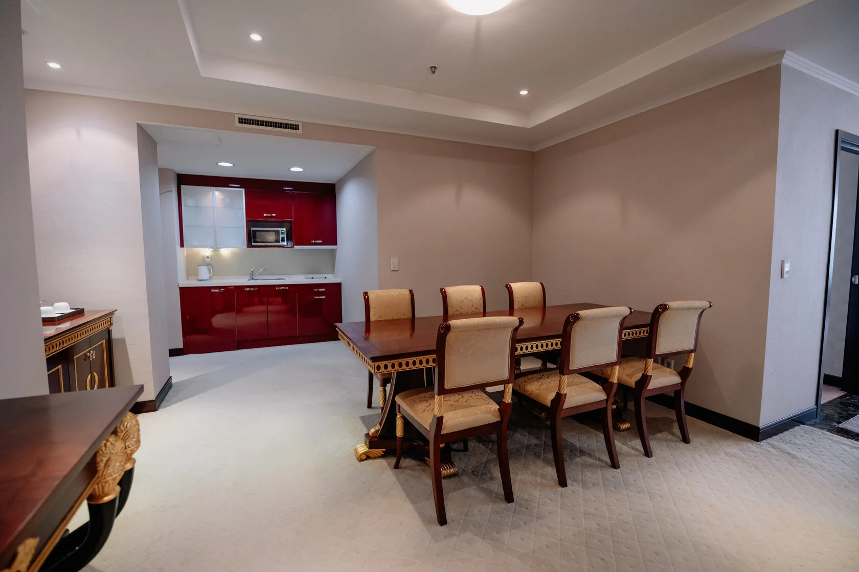Просторная гостиная, кухня, две спальни и большая ванная комната делают этот номер удобным для проживания VIP-гостей с друзьями или целой семьей. Два рабочих места и три кровати позволяют сделать из апартаментов настоящий дом для нескольких семей, где можно и работать, и отдыхать. А в конце дня собираться всем вместе перед телевизором в гостиной на большом диване и мягких креслах.