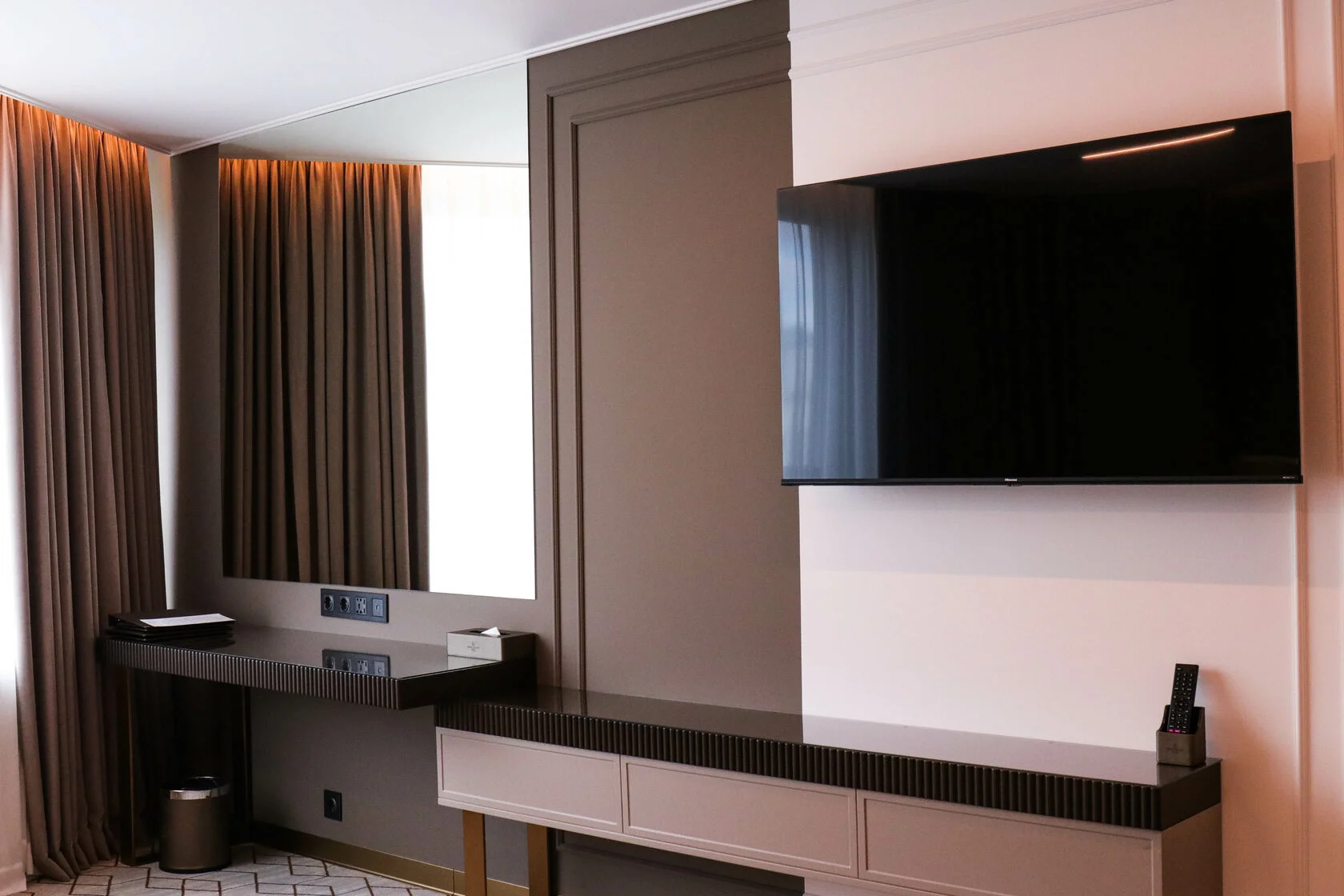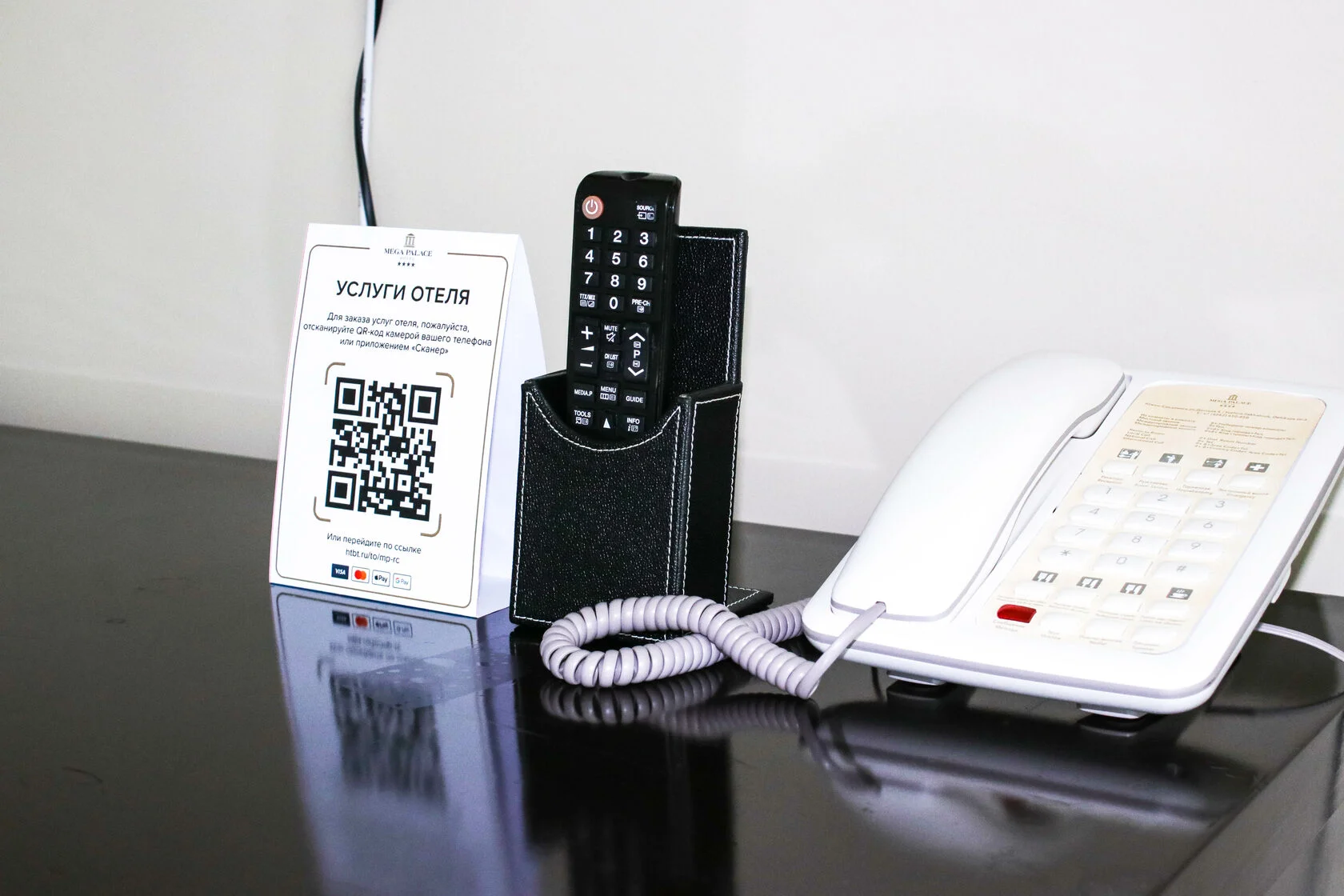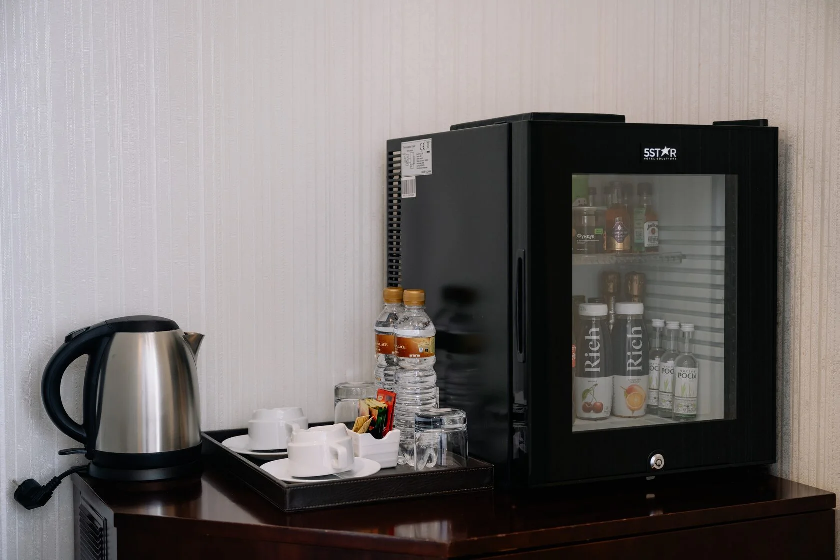 в номере: Телевизор, Холодильник, Мини-бар, Чайник, Рабочий стол, Телефон, Сейф, Комплект офисных принадлежностей.