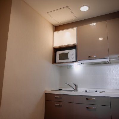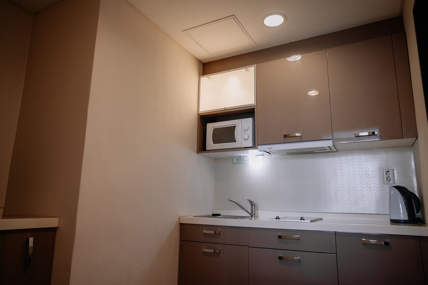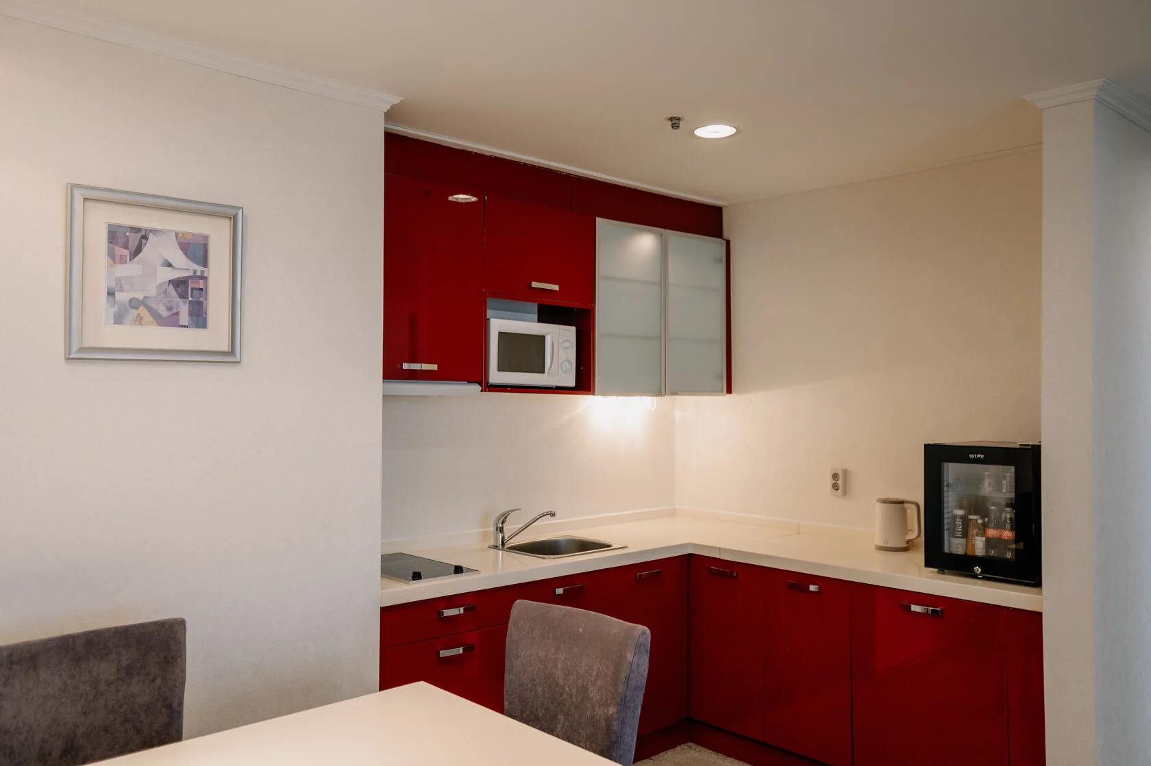 Современный двухкомнатный номер: спальня с двуспальной кроватью, гостиная с мини-кухней.