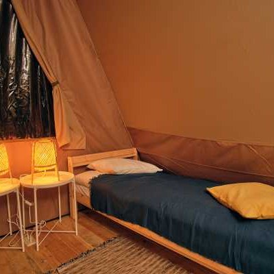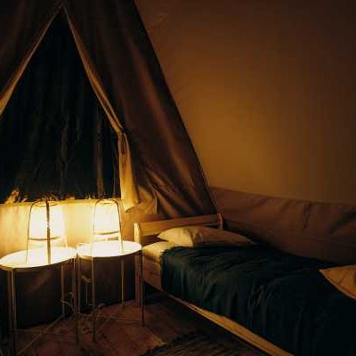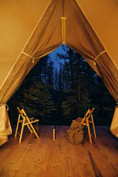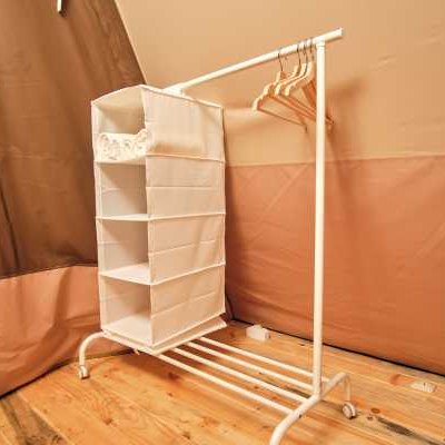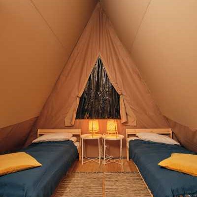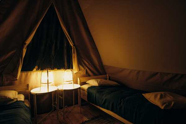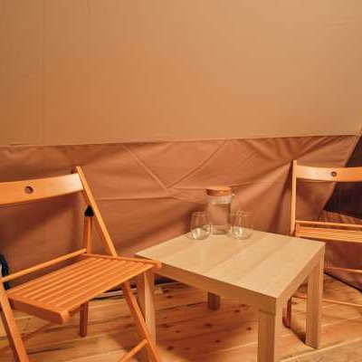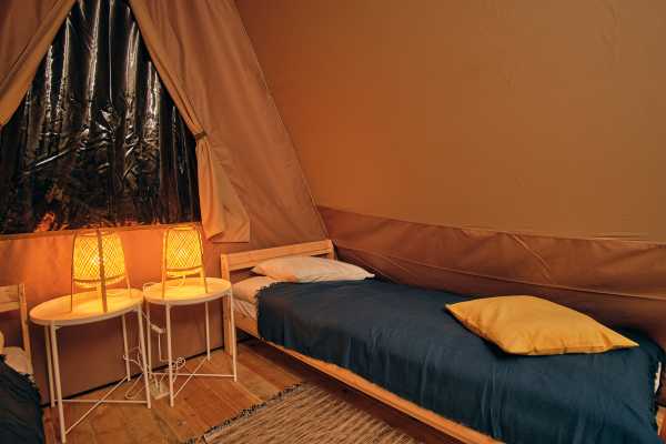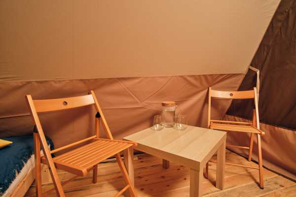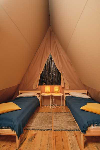 В каждом лесном шатре есть 2 удобные кровати, вешалки, стол, стулья, туалет и душ на территории.
