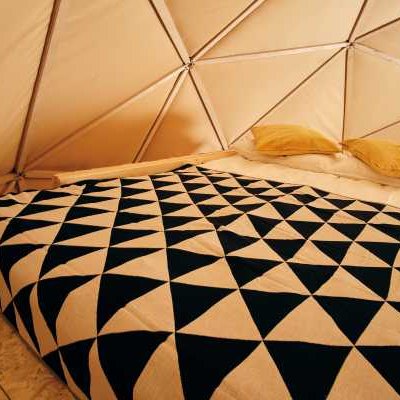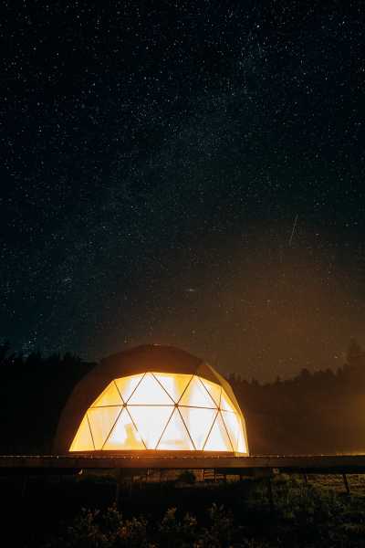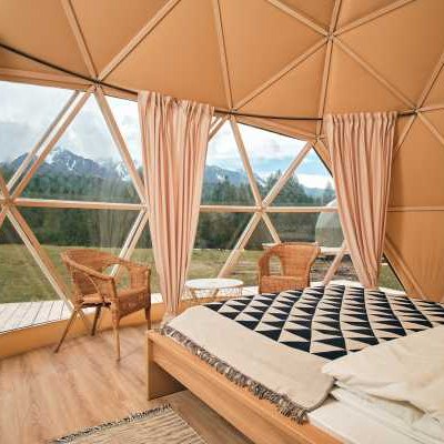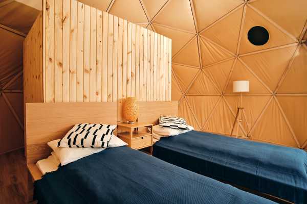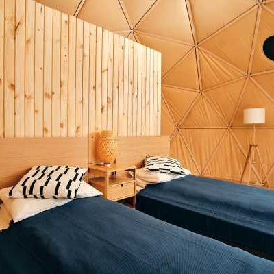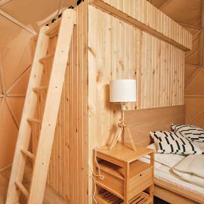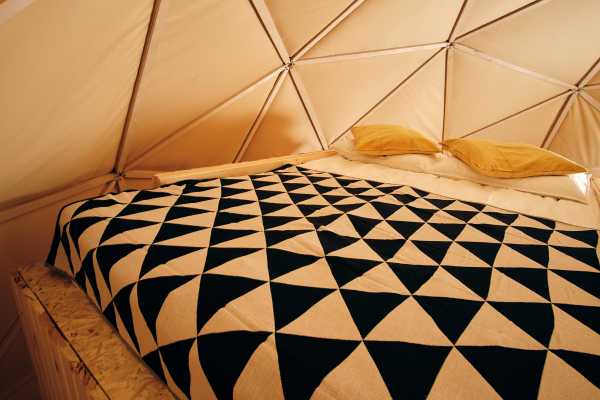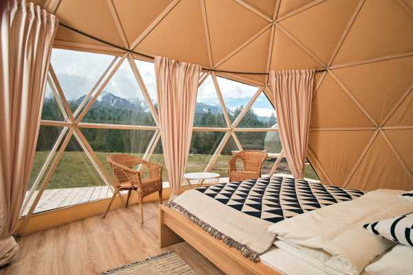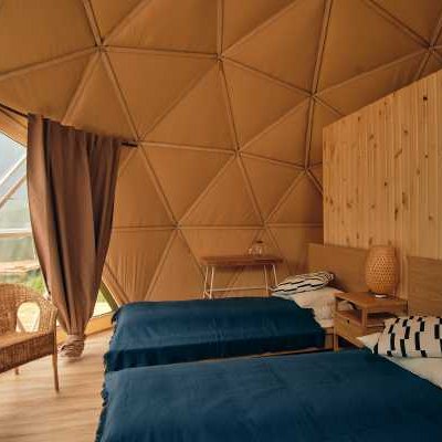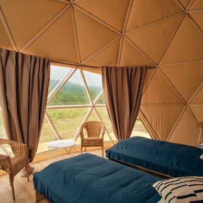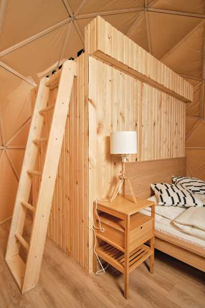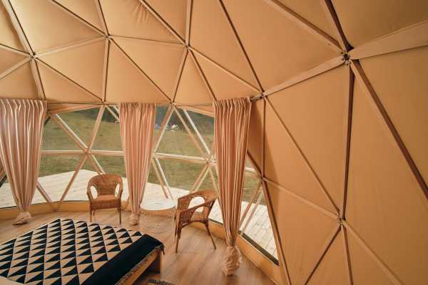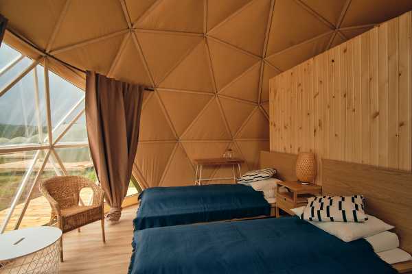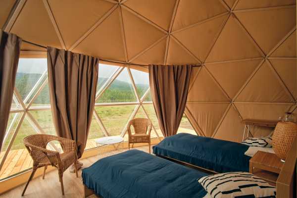 В каждом купольном доме — одна двуспальная кровать и 2 дополнительных спальных места, биотуалет, раковина с водой, рабочая зона и журнальный столик с креслами.
