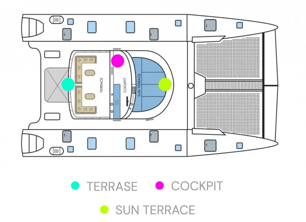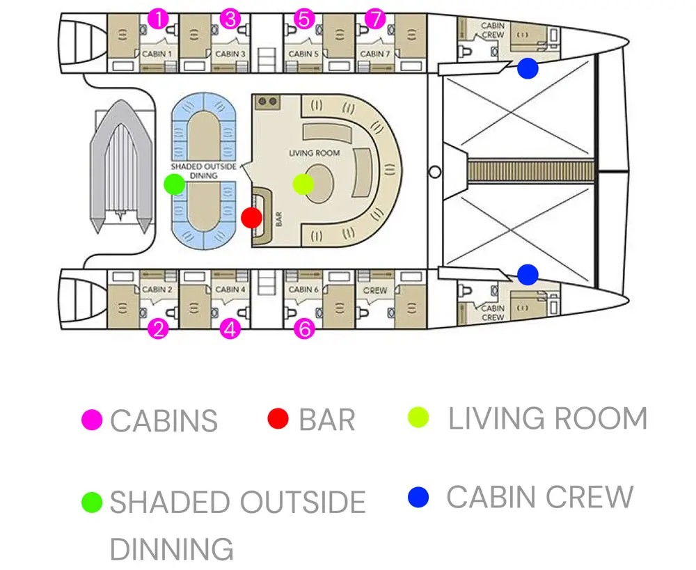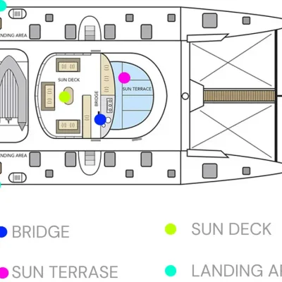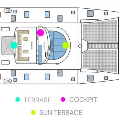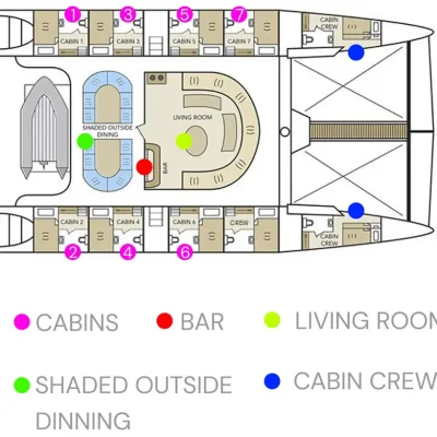 Идеально подходит для круизов с друзьями и семьей. Может принять на борту 12 пассажиров. 6 двуместных кают каждая с отдельной ванной и горячей водой, расположены по обе стороны корпуса корабля.