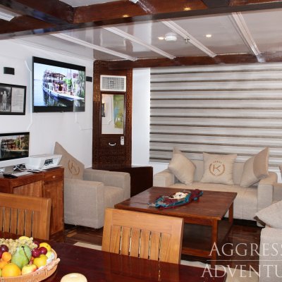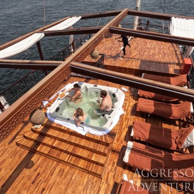 На судне есть прекрасный просторный салон, большая затененная солнечная палуба, джакузи, шезлонги и шезлонги, а также бар.