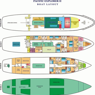 Всего на Pacific Explorer II 12 кают с кондиционером, коврами, туалетом и душем.