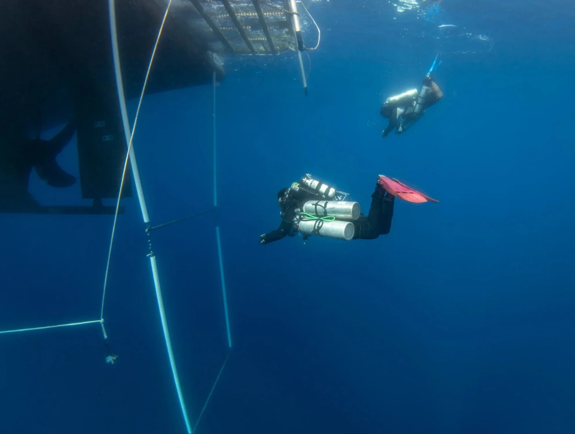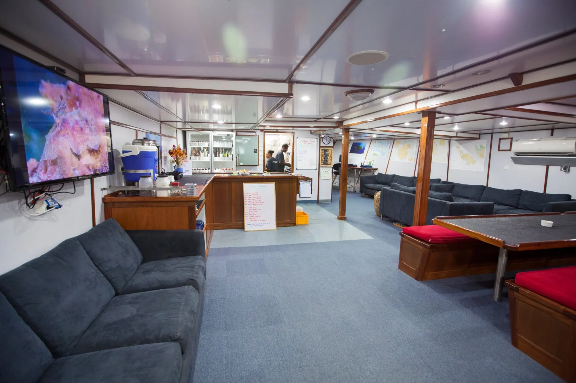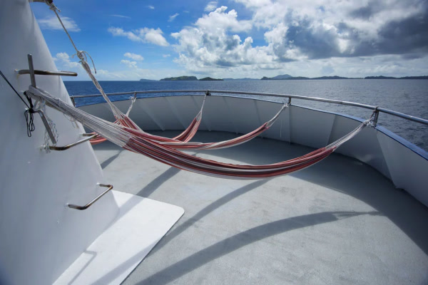 Просторная дайв-палуба ведущая к платформе для погружений и включающая специальную зону для фотографов.
