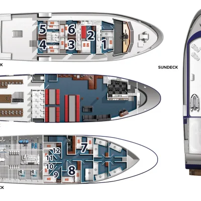 На борту располагаются 12 комфортабельных кают, которые могут разместить до 20 гостей. Каюты делятся на несколько категорий:
