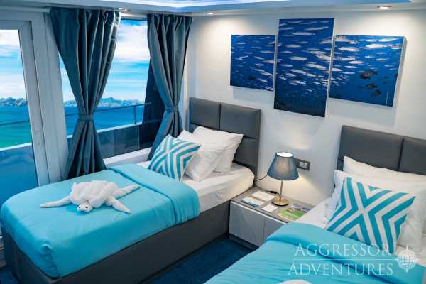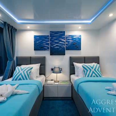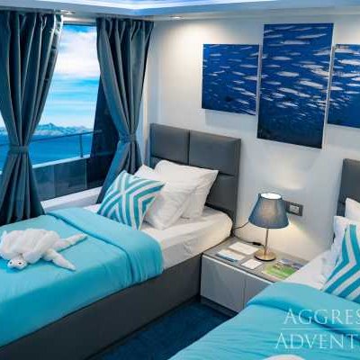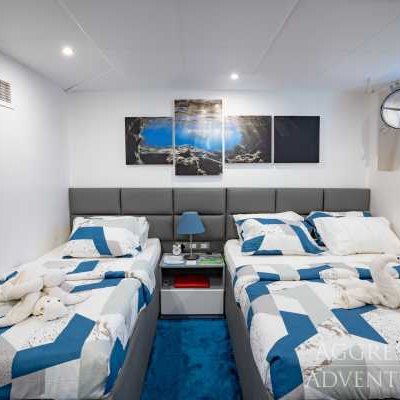 Комфортное размещение для 24 гостей включает 12 просторных кают: 4 на нижней палубе, 4 на главной палубе и 4 каюты с балконом на верхней палубе. Во всех каютах есть собственная ванная комната с душем. В каждой каюте — достаточно места для хранения вещей и индивидуальный климат-контроль. В каютах есть сейф для хранения ценностей, таких как паспорта, наличные, кредитные карты и любых других вещей, которые вы хотели бы убрать.