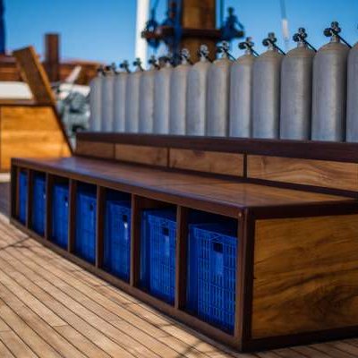 Палуба, на которой расположен дайв дек предлагает 14 отдельных боксов для подготовки к погружению и хранения снаряжения.