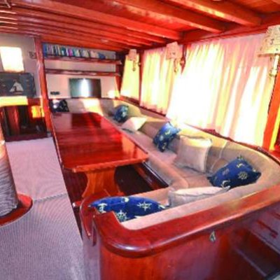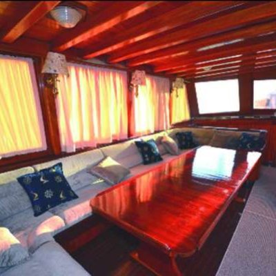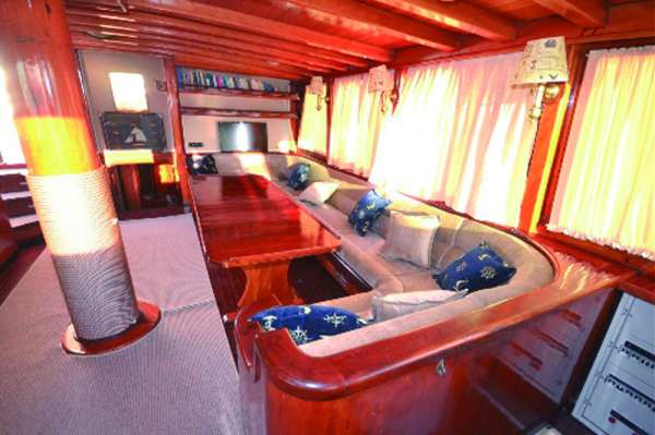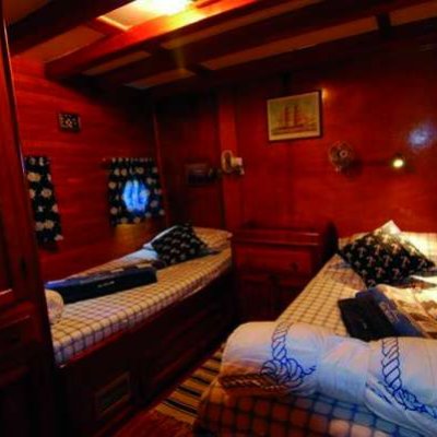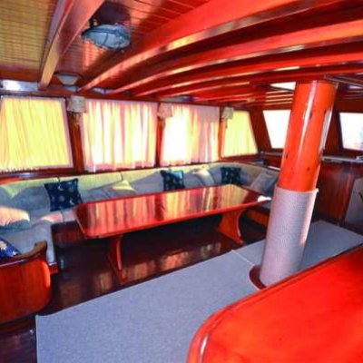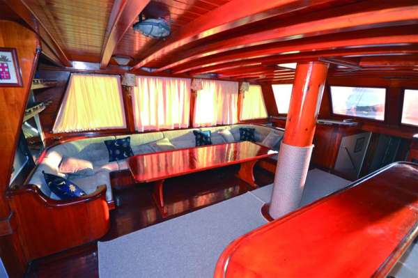 Корпус и внутренняя отделка судна полностью выполнена из дерева, причем не простого, а красного: использовались породы махагониевого дерева и ироко. Гости будут располагаться в 5 двухместных и 2 трехместных каютах, каждая их которых оборудована кондиционером и современным санузлом.