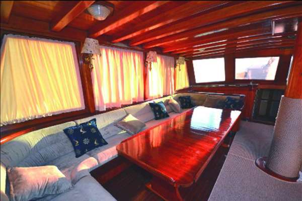 Корабль имеет широкую палубу впереди , а также удобную и просторную веранду на корме со столиками, диванами и подушками.