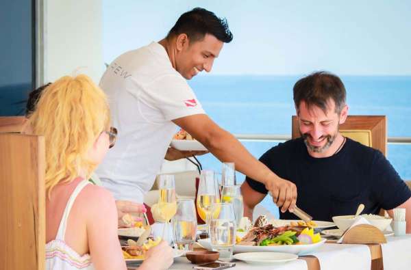 Зона отдыха на верхней палубе оборудована небольшим навесом с легкими белыми занавесями. Это место может использоваться как для отдыха, так и для SPA или приватных ужинов. Если вы захотите остаться наедине, вам нужно просто сказать об этом персоналу, и вас не побеспокоят другие гости яхты.