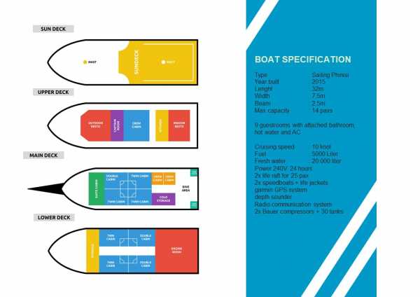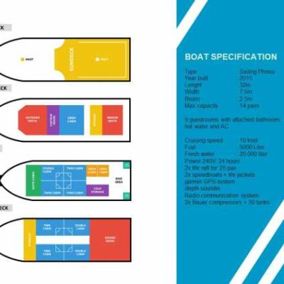 Seamore Papua имеет 4 палубы: верхняя каюта или солнечная палуба, где вы найдете кресла-мешки для послеобеденного сна, загара или наблюдения за звездами ночью.