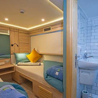 Все каюты оборудованы кондиционерами и санузлами со всеми необходимыми туалетными принадлежностями.