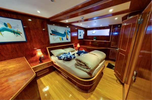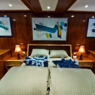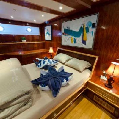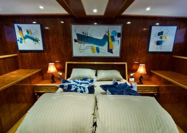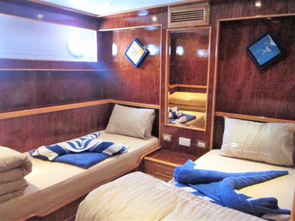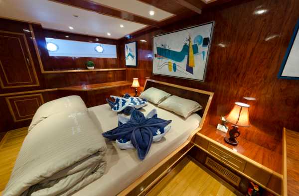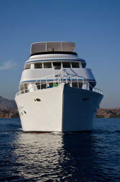 На первый план ресторан в прекрасной деревянной, финиширующей с удивительным видом на море панорамы. Ежедневные блюда, в сочетании с египетской и международной кухней, недавно приготовлены и подаются в стиле шведского стола. Между погружениями подаются сладкие и соленые закуски. Вода, кофе, чай и безалкогольные напитки предлагаются в течение дня. На главной палубе элегантный, просторный салон хорошо оснащен современной развлекательной системой и приглашает расслаблять. На верхней палубе есть еще один большой, полностью кондиционированный лаундж с баром. Большая, частично затененная солнцезащитная палуба приветствует как дайверов, так и не дайверов с со вкусом мест для сидения, полностью оборудованным открытым баром и на высокой палубе еще одна просторная зона для всех любителей солнца.