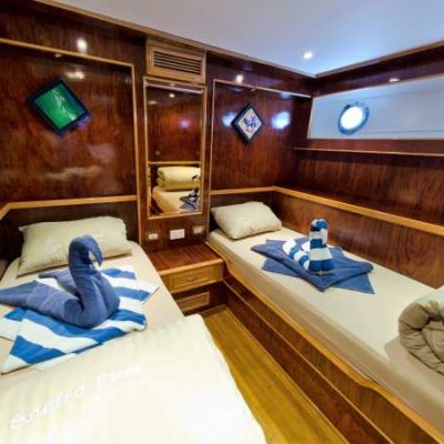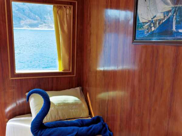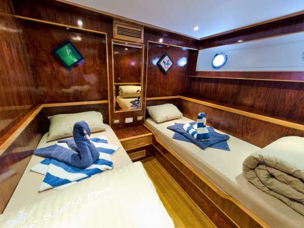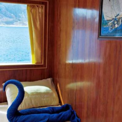 Электричество 220 В с 2-контактными розетками европейского образца. В каюте вы также найдете спасательные жилеты, огнетушитель, детектор дыма и сейф для личных вещей.