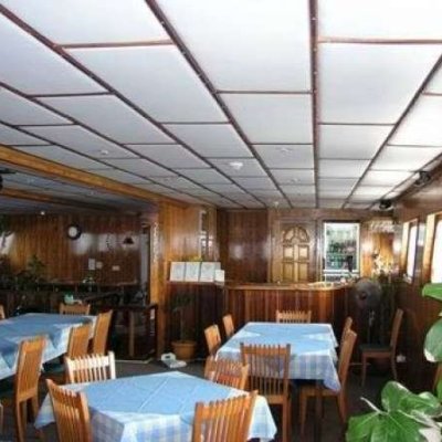 Затенённое пространство на носу с диванами и столиками, 2 солнечные палубы, одна из которых оборудована шезлонгами и мини-бассейном,ресторан в кондиционированной кают-компании, зона