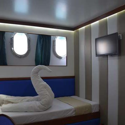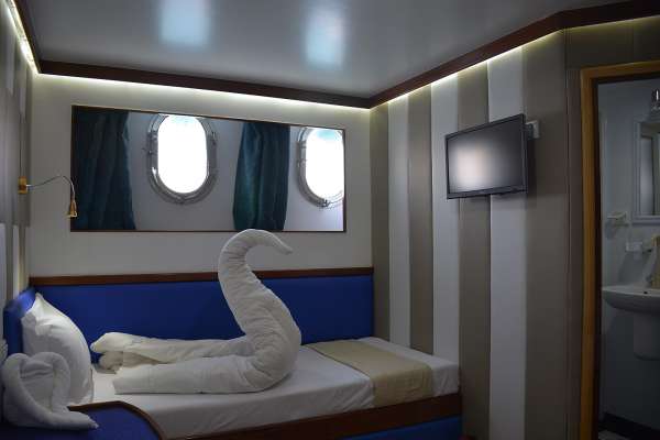 Две раздельные кровати на одном уровне, иллюминатор, шкаф, душевая, туалет, фен, полотенца.