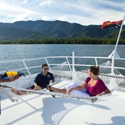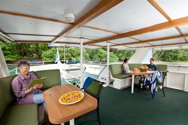 После дайвинга большинство гостей направляется на сан-дек, ведь здесь можно хорошо расслабиться (загорая или же наоборот, отдыхая в тенечке), угостившись холодным напитком и вкусной закуской.