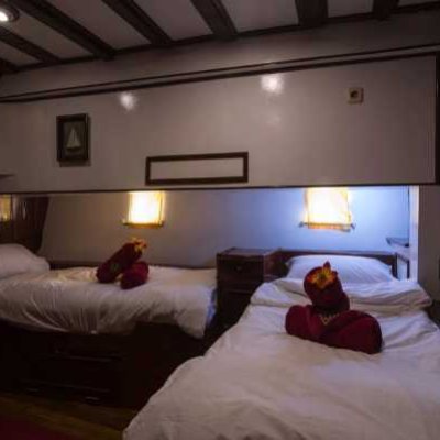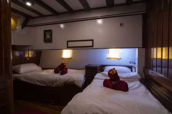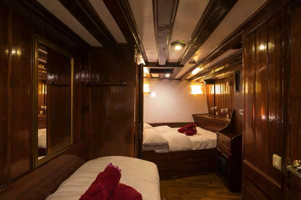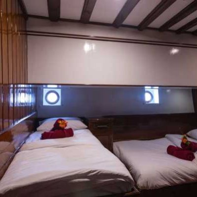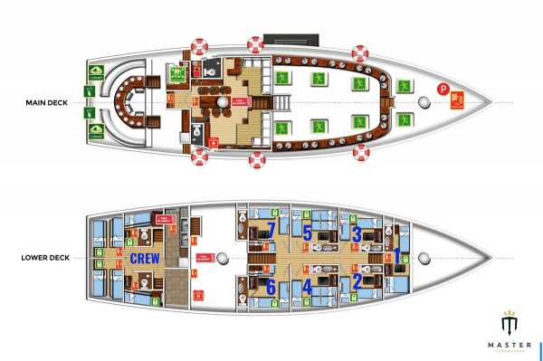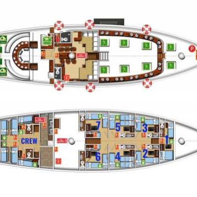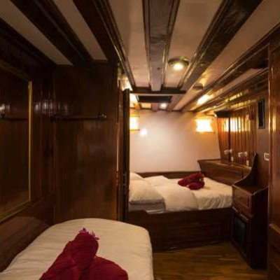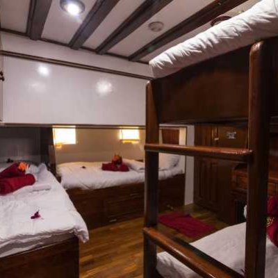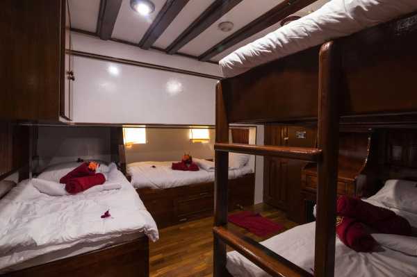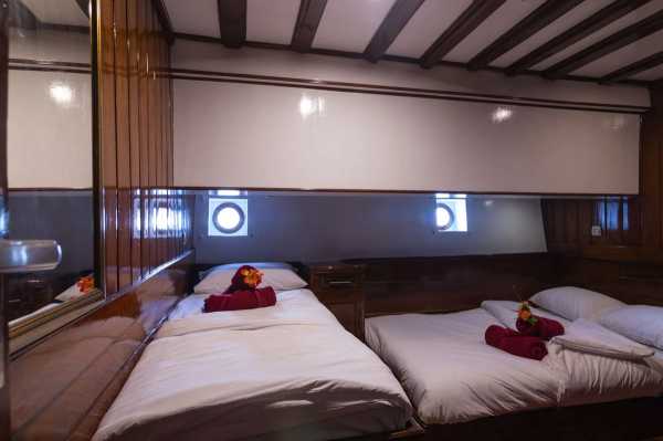 Двухместная каюта На яхте три таких каюты на нижней палубе. В носовой каюте установлена стационарная двуспальная кровать с дополнительной односпальной, а в двух средних каютах установлены односпальные кровати, которые можно превратить в двуспальные. Стационарная двухместная каюта В распоряжении гостей две таких каюты на нижней палубе, в каждой из которых могут разместиться до 2 дайверов на стационарных односпальных кроватях. Четырехместная каюта Две четырехместные каюты на нижней палубе. В них могут разместиться до четырех дайверов на двух односпальных кроватях и двухъярусной кровати. Все каюты оснащены собственными ванными комнатами. Благодаря кондиционерам ваше пребывание на борту будет комфортным.
